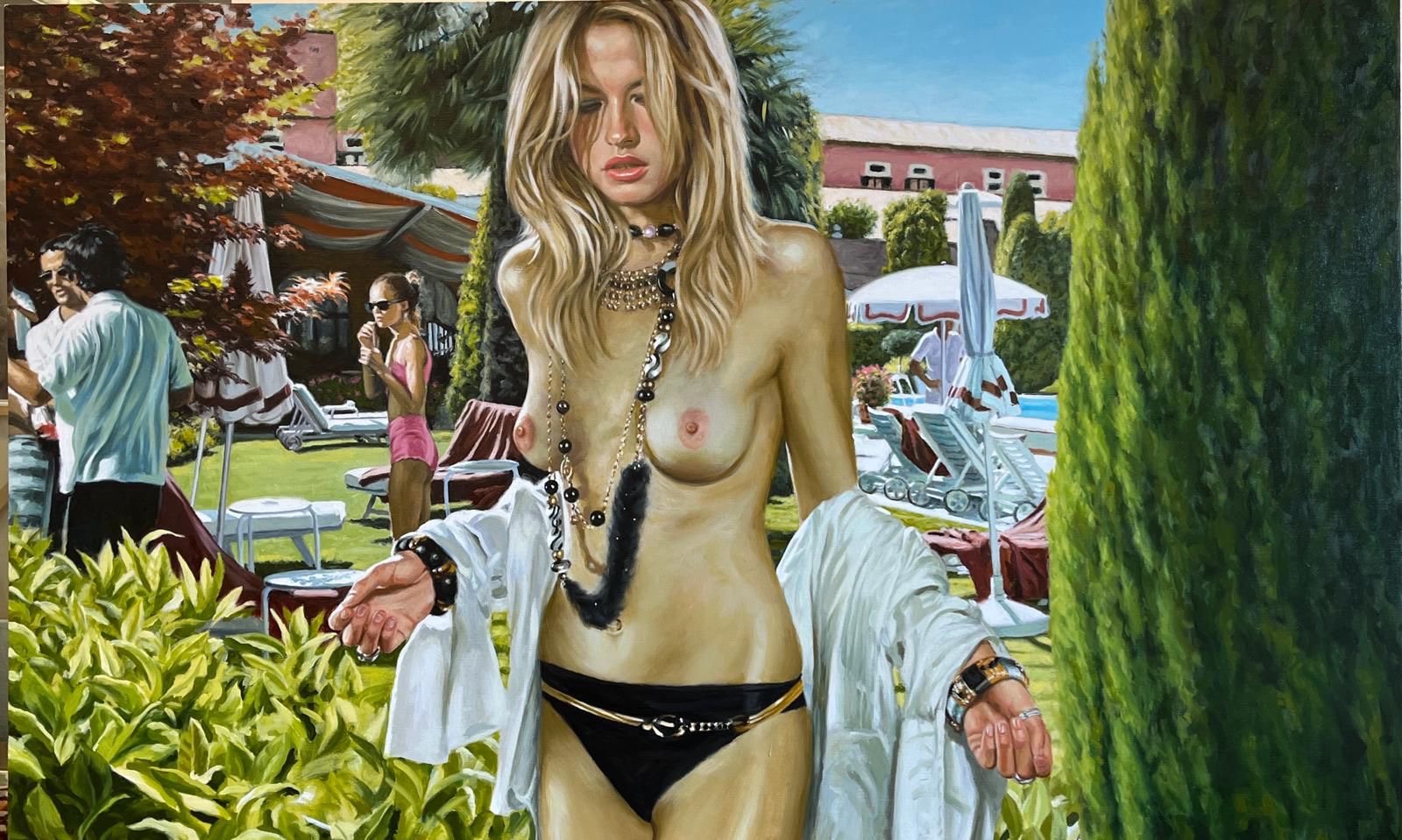Un'altra opera della mostra collega il lavoro dell’artista con l’Italia: "Cipriani", 2024, in cui emergono con nitidezza gli elementi distintivi degli esterni dell'hotel veneziano. Le sdraio disposte ordinatamente, le sedie sullo sfondo, la piscina, il rigoglioso giardino e l'incantevole vista della città risultano familiari, è l'inserimento dei soggetti e la presenza della figura femminile in primo piano a richiamare lo stile distintivo dei personaggi caratteristici delle opere di Rodgers.