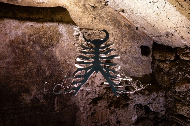 Parte integrante dell’opera che restituisce l’immagine di una superficie sospesa la cui trama irregolare e vibrante, assume la forma di una membrana organica, è il raffinato lavoro di composizione elettroacustica, elaborato da Marco Vidino che crea un paesaggio sonoro traducendo il pensiero dell’artista in frequenze, risonanze e modulazioni. A completare il tutto il video di Upsaid production, che traduce in immagini il concetto dell’opera, frammenti e sovrapposizioni costruiscono una narrazione visiva che, dalla goccia al mare, ne amplifica il senso. Il risultato è una vera e propria esperienza immersiva di conoscenza di un processo di trasformazione e di evoluzione che ha nell’acqua il suo elemento costante, bacino di elementi da trasformare ma allo stesso tempo di vita da preservare. In tal senso l’artista colloca all’interno dello spazio sculture, gabbie toraciche attraverso le quali da un lato rimanda al pubblico la percezione del fragile confine tra vita e dissoluzione, dall’altro evidenzia il valore della gabbia come luogo di conforto, accoglienza dove sono collocati gli organi principali per la vita, dai polmoni al cuore. Così ancora una volta lo spazio diventa esso stesso un microcosmo, l’acquedotto diventa luogo di raccoglimento e contemplazione, un organismo amplificato fatto di arterie, vene, ossa e trame cromatiche che emergono nell’oscurità del luogo. Le scelte materiche e tecnologiche mettono in evidenza la responsabilità dell’uomo nei confronti della natura, allontanando ogni idealizzazione romantica per restituire la concretezza del conflitto tra essere umano e ambiente. Il tappeto luminoso che accompagna il visitatore, evocando fondali marini, rende tangibile la circolarità tossica della plastica: dal mare, ai pesci, ai nostri corpi.