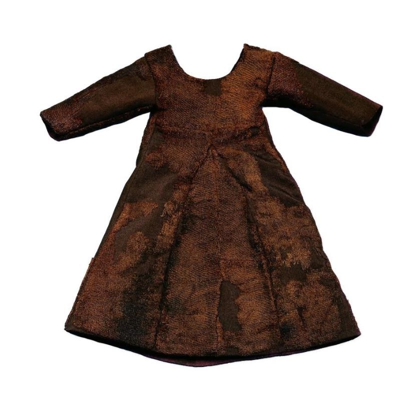 La piccola veste, che farà bella mostra ad inizio del percorso espositivo, proviene da scavi condotti nel 1921 a Herjolfnaes sulla costa orientale della Groenlandia, che portarono al rinvenimento di un cospicuo numero di costumi, databili per la maggior parte al Trecento. L’abitino era probabilmente confezionato per una bambina di tre anni. Il busto e le maniche sono strette, mentre la parte inferiore si allarga verso il fondo grazie all’inserzione di due gheroni triangolari davanti e due dietro, posti al centro della figura. Quelli anteriori partono da uno sprone che manca nella parte posteriore. L’ampio scollo ovale non rende necessari spacchi o allacciatura per indossare il capo. Probabilmente la veste era stata cucina con un tessuto riciclato da un altro abito, come dimostrerebbe lo sprone anteriore, non riscontrabile negli esemplari coevi effettivamente pervenuti o raffigurati nei dipinti. Il tessuto, costruito con una lana locale lavorata su di un telaio verticale a intreccio classico (saia da 2 lega 2), aveva in origine un ordito grigio e una trama bianca, privi di tintura. La forma, aderente in alto e alle maniche e più ampia in fondo, è quella semplificata degli abiti degli adulti, con un numero minimo di gheroni, date le piccola dimensioni della veste: un’esemplificazione significativa del taglio sartoriale del tempo. È interessante notare come, anche nei luoghi più remoti e distanti dai centri dove s’inventavano e si elaboravano le fogge, che facevano moda, queste fossero conosciute e in qualche modo seguite: i ritrovamenti della Groenlandia nel loro insieme ripercorrono le variazioni del taglio che caratterizzano il XIV secolo in tutta Europa.