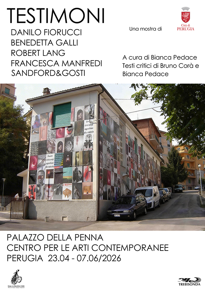 Testimoni, con opere di Danilo Fiorucci, Benedetta Galli, Robert Lang, Francesca Manfredi, Sandford&Gosti, a cura di Bianca Pedace. L’esposizione sarà documentata da un catalogo con testi dell’Assessore Marco Pierini, della curatrice e di Bruno Corà.