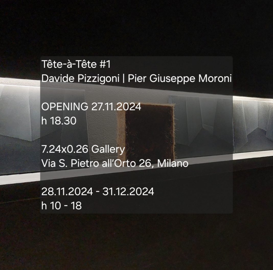 Tête-à-Tête #1 è il primo di una serie di installazioni nello spazio 7.24×0.26 Gallery. Un dialogo tra Pier Giuseppe Moroni e Davide Pizzigoni: i lavori con i capelli di Pier Giuseppe Moroni e i volumi visionari di Davide Pizzigoni formano una scenografia segreta di forte impatto visivo.