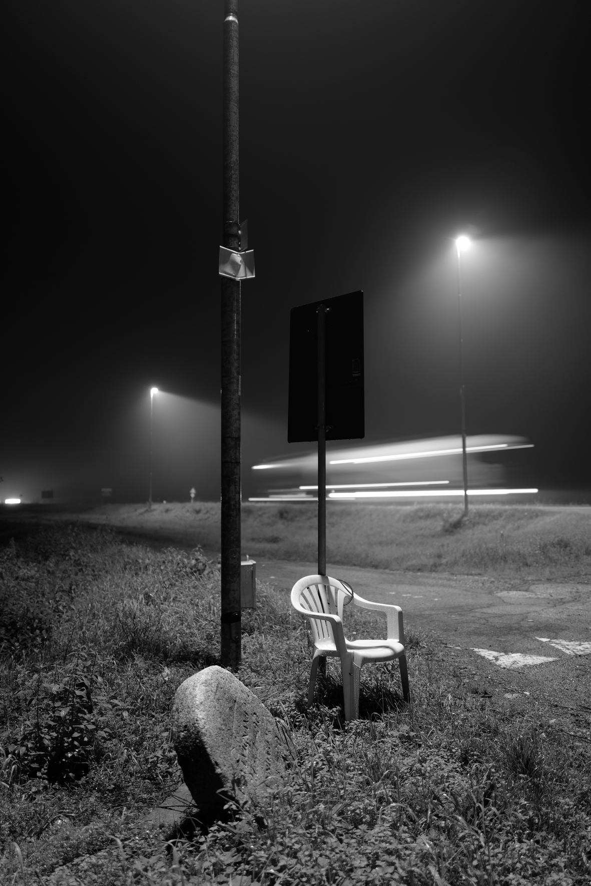 Lo sguardo di Solzi, intimo e attento, riesce a documentare questo luogo lasciandoci immaginare chi sono i suoi frequentatori, chi lo reclama come proprio chiedendo allo stesso tempo tutela e diritti. Una sedia di plastica viene legata ad un palo con una catena, quasi a rivendicare e proteggere una posizione, dissimulando la precarietà e il pericolo che la caratterizzano.