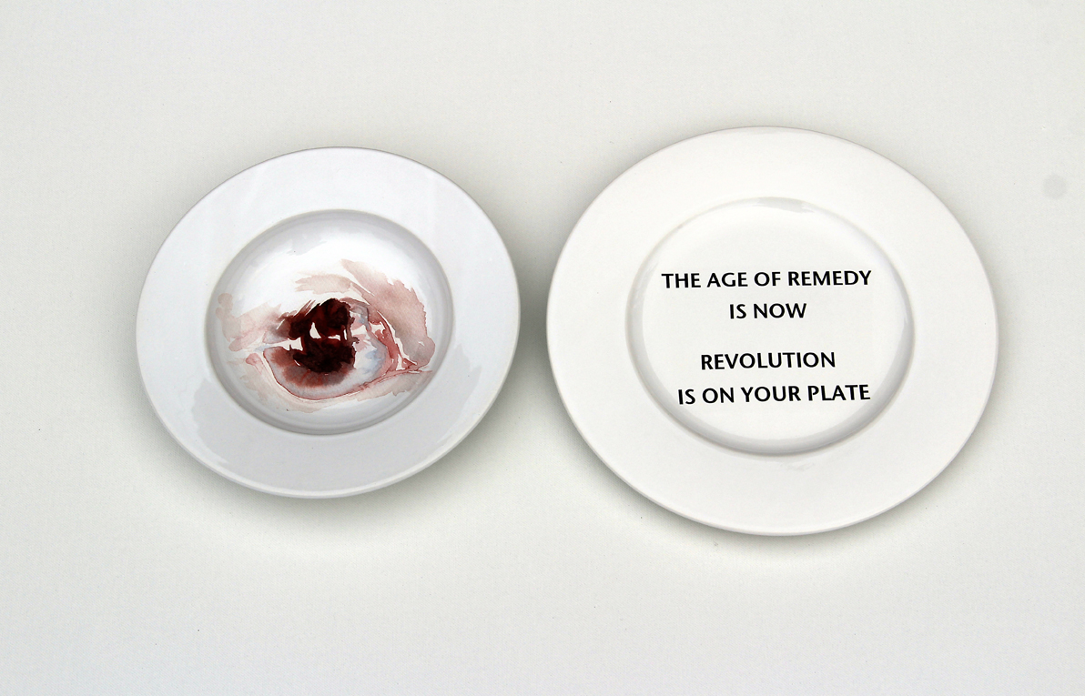 I piatti fondi contengono il dipinto dell’occhio di un coniglio che l'artista aveva salvato dal macello, mentre quelli piani riportano la scritta: THE AGE OF REMEDY IS NOW. REVOLUTION IS ON YOUR PLATE. Il numero vertiginoso scritto su ogni piatto rimanda alla tensione verso un’utopia concreta, mentre sancisce la possibilità del progetto di trascendere la vita stessa dell’artista, nell’autonomia dell’opera.