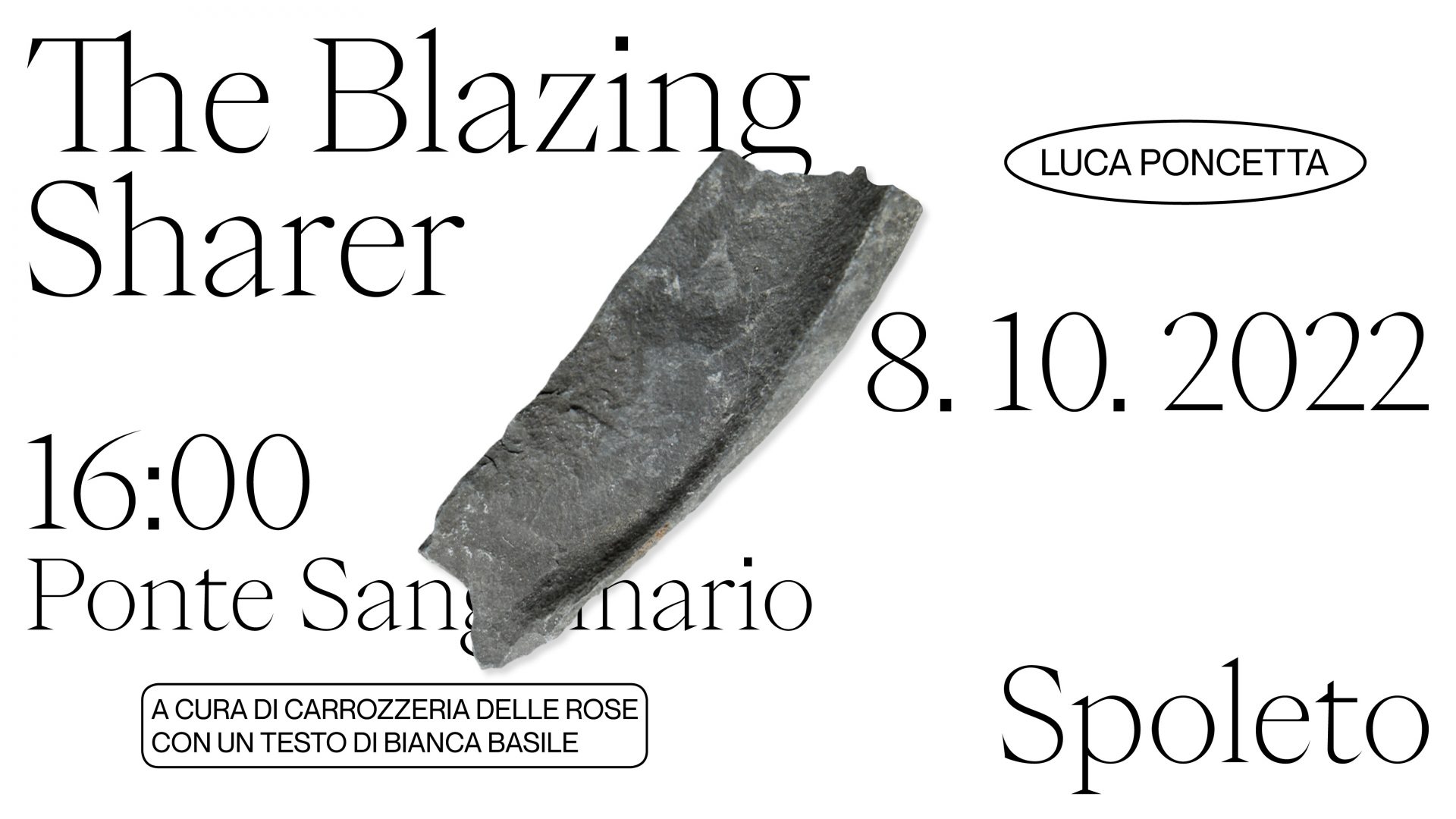 The Blazing Sharer, racchiude due interventi scultorei site-specific per il Ponte Sanguinario, luogo di forte connotazione storica e morfologica. Il Ponte ha avuto tanti smottamenti di cambio funzionale nel tempo. Da quando ha smesso di essere passaggio del fiume, nota Bianca Basile, il sito archeologico ha subito un interramento, un allagamento e una successiva sopraelevazione, si fa dunque simbolo di passaggio e di trasformazione.