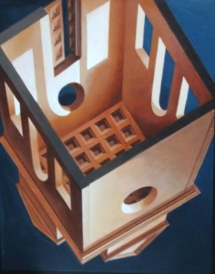 Sono costruzioni compatte e simmetriche quelle dei dipinti di Alberto Andreis, regolate da un progetto e da una geometria rigorosamente calcolati per poter stare in piedi senza problemi. Ma invece, pur essendo fatte di mattoni, malta e cemento, ruotano prive di peso come satelliti nel vuoto o stazioni spaziali orbitanti. I colori di queste architetture che a causa di qualche misteriosa forza si sono staccate dal resto, che si suppone sia rimasto ancorato a terra, sono tutti nelle tonalità dei bruni, dei grigi e delle ocre (colori piuttosto velati nelle campiture esterne delle strutture, come se la rotazione continua avesse asportato una parte del colore originario). C’è, in questi dipinti, una persistente sensazione di vertigine, e per associazione viene in mente il cinema di Hitchcock che con la pittura, specialmente surrealista, ha un particolare feeling. Ad esempio La donna che visse due volte, e non soltanto per il disagio di Scottie (soffre, appunto, di vertigini) ma anche per l’atmosfera carica di prospettive e situazioni ambigue che pervadono il film. L’impianto neoclassico del disegno a carboncino si arricchisce di una patina di bruma che si posa sulle architetture rendendole, anche in presenza di questo plumbeo gigantismo, leggere architetture dell’intimità, come una piranesiana gabbia toracica che nel suo lento movimento respira un pensiero metafisico dopo l’altro.