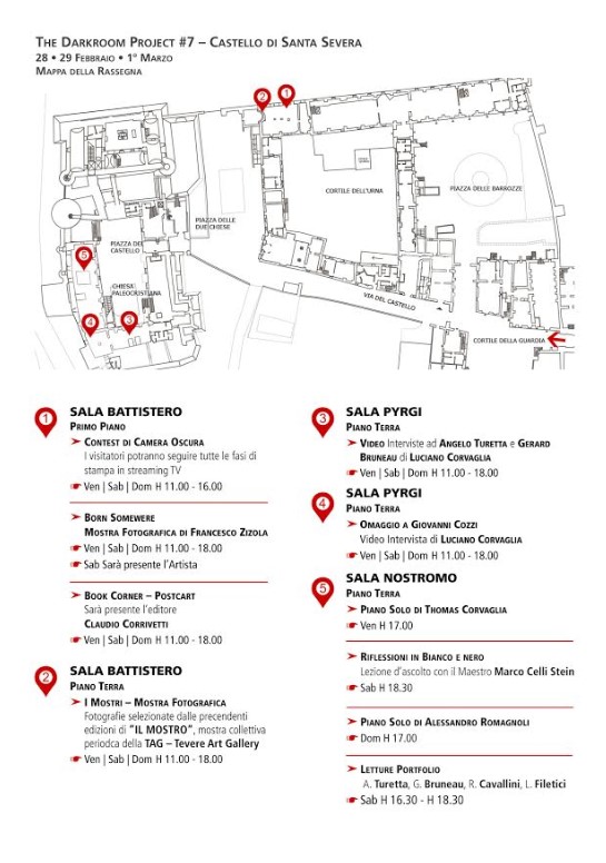 The Darkroom Project #7 è parte del programma di valorizzazione del Castello di Santa Severa come centro di Posta giovanile nel l’ambito del progetto “Itinerario Giovani” finanziato dalla Regione Lazio Politiche Giovanili e dalla Presidenza del Consiglio dei Ministri – Dipartimento per la Gioventù. L’evento è prodotto e organizzato dalla Tevere Art Gallery in collaborazione con Scuderie MArteLive.