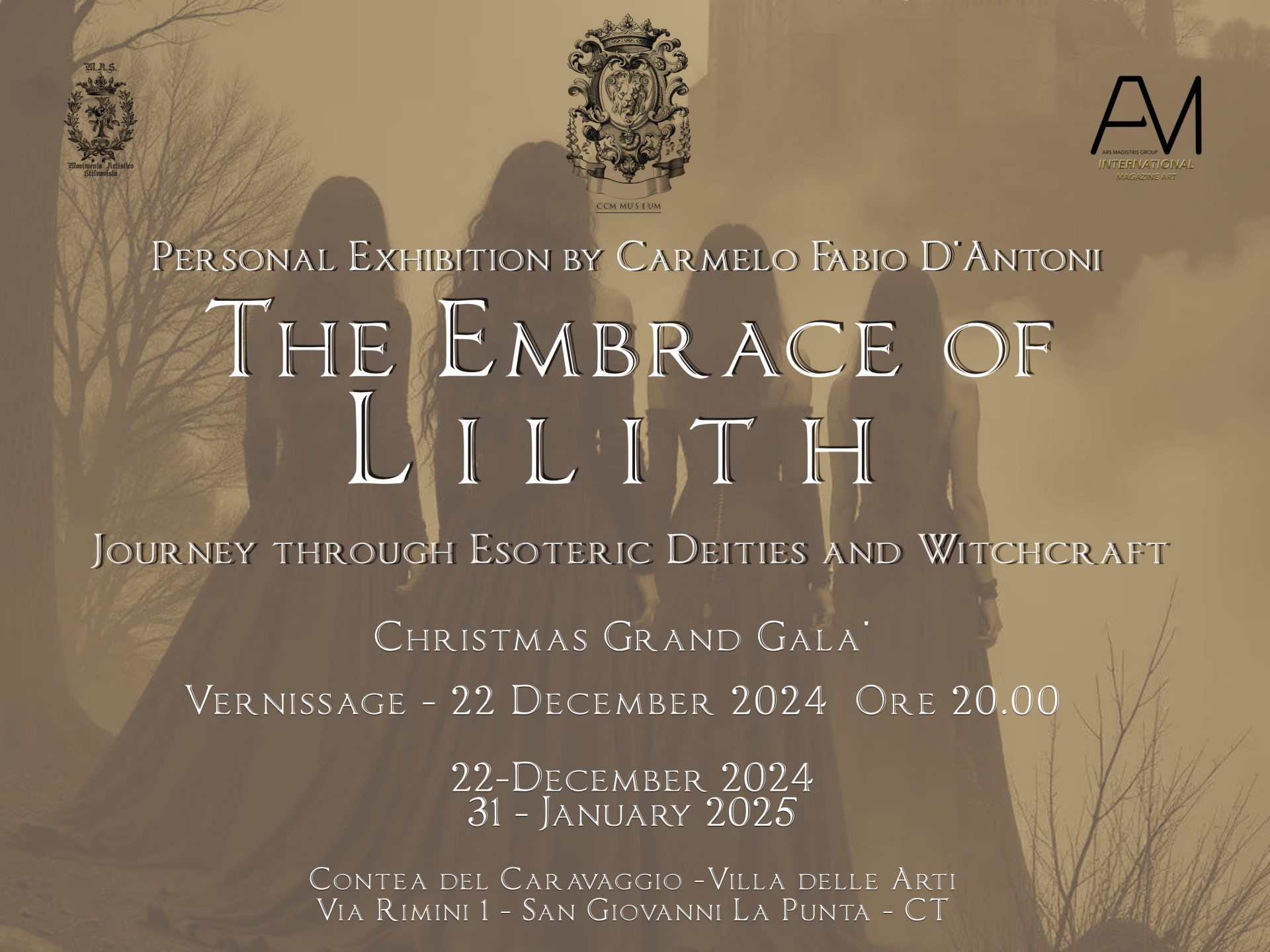 La Contea del Caravaggio - Villa delle Arti, sita in Via Rimini 1, San Giovanni La Punta, CT, da domenica 22 dicembre, sarà l'affascinante cornice di un evento artistico di straordinaria bellezza e intensità: "THE EMBRACE OF LILITH - L'abbraccio di Lilith", una mostra personale dell'artista Carmelo Fabio D'Antoni, rinomato esponente del Dolce Stil Novo. Questa esposizione rappresenta un autentico viaggio all'interno dell'universo esoterico e della stregoneria, esplorando il complesso intreccio tra magia, mistero, divinità non tralasciando anche la magia della Santità attraverso una serie di opere inedite e non, che catturano lo sguardo e stimolano l'immaginazione in modo profondo e coinvolgente.