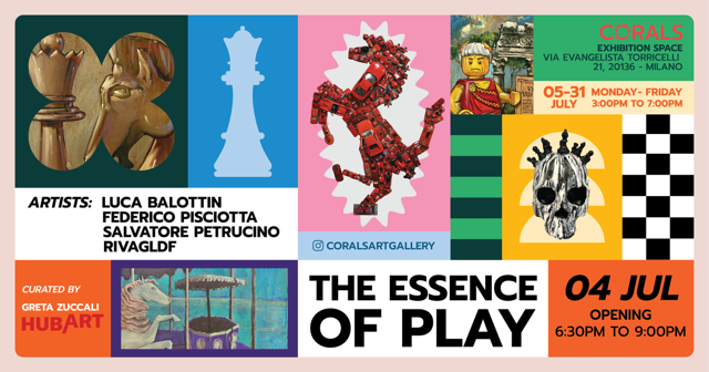Inaugura giovedì 4 luglio, presso lo spazio espositivo Corals, la mostra dal titolo “L’essenza del gioco” con gli artisti Luca Balottin, Federico Pisciotta, Salvatore Petrucino e RivaGLDF, a cura di Greta Zuccali.