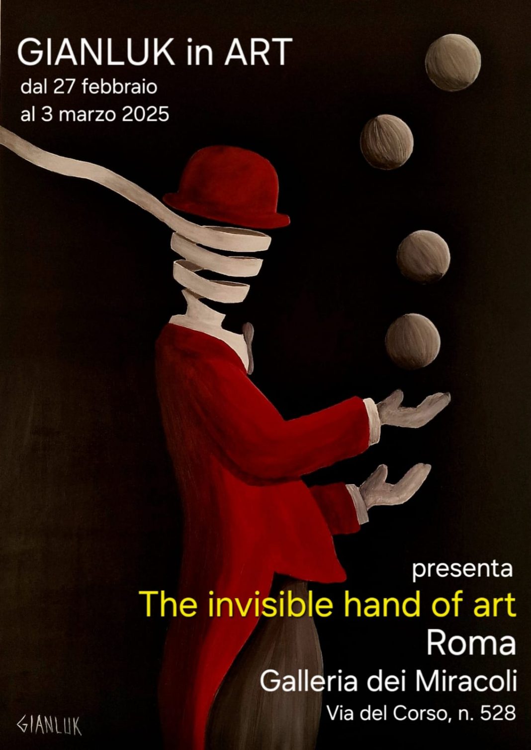 A dieci anni dalla sua prima tela, Gianluca De Grazia, in arte Gianluk, docente di economia e pittore autodidatta è in mostra nell’anno giubilare a Roma alla Galleria dei Miracoli in Via del Corso n. 528 con una personale dal titolo “La mano invisibile dell’arte”.