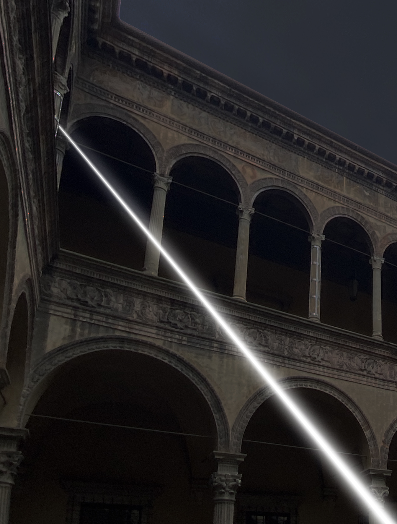 L’intervento riconfigura l’affascinante cortile rinascimentale sovrapponendovi una realtà alternativa frutto della visione dell’artista. Un taglio di luce che, come uno squarcio, divide l’ambiente e attraverso di esso è possibile accedere ad uno spazio mentale, astratto e geometrico.