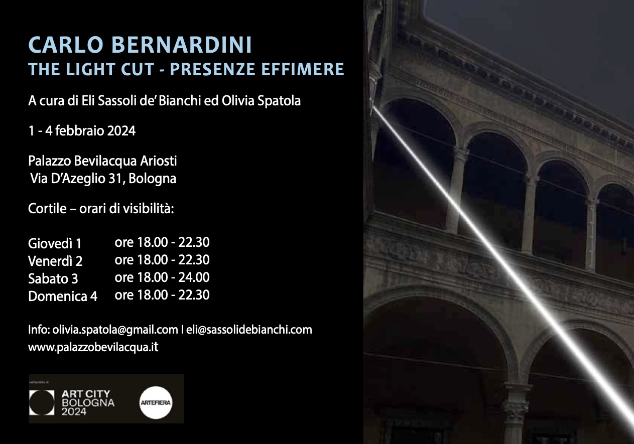 Palazzo Bevilacqua Ariosti, in occasione del cinquantesimo anniversario di Arte Fiera Bologna, ospiterà l’installazione luminosa The light cut – presenze effimere dell’artista Carlo Bernardini, a cura di Eli Sassoli de’ Bianchi e di Olivia Spatola.