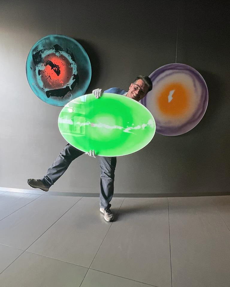 sbocciano in primavera fiori dai mille colori. Davide Paglia si ispira ai sui colori, tradotti in Opere circolari da una luminosità spaziale. Tra Arte e Design.