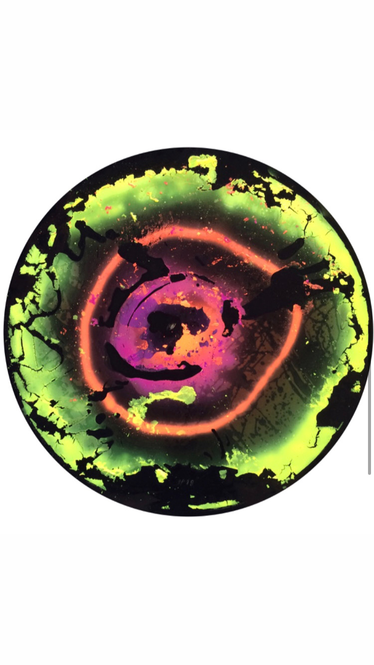 Dischi di luce che mostrano la pura essenza metamorfica del colore, gettato in una proliferazione di analogie e dissonanze tra ectoplasmi mobili di vividi effetti cromatici. Attraversato il glaciale prisma ottico della scomposizione della luce-vibrazione, la luce si infrange come un’onda in una dissipazione caleidoscopica di fantasmagorie fluide di frequenze spettrali dove si manifesta tutta la dissipazione del colore nell’atmosfera antropologia del visibile.