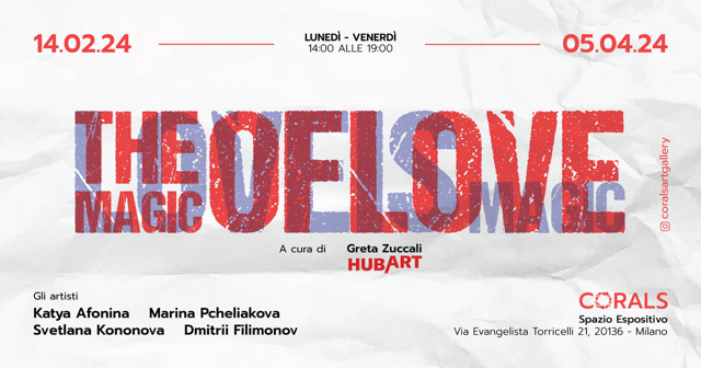In occasione del giorno di San Valentino, lo spazio espositivo Corals inaugura la mostra “The magic of love” a cura di Greta Zuccali gli artisti Katya Afonina, Marina Pcheliakova, Svetlana Kononova, Dmitrii Filimonov.