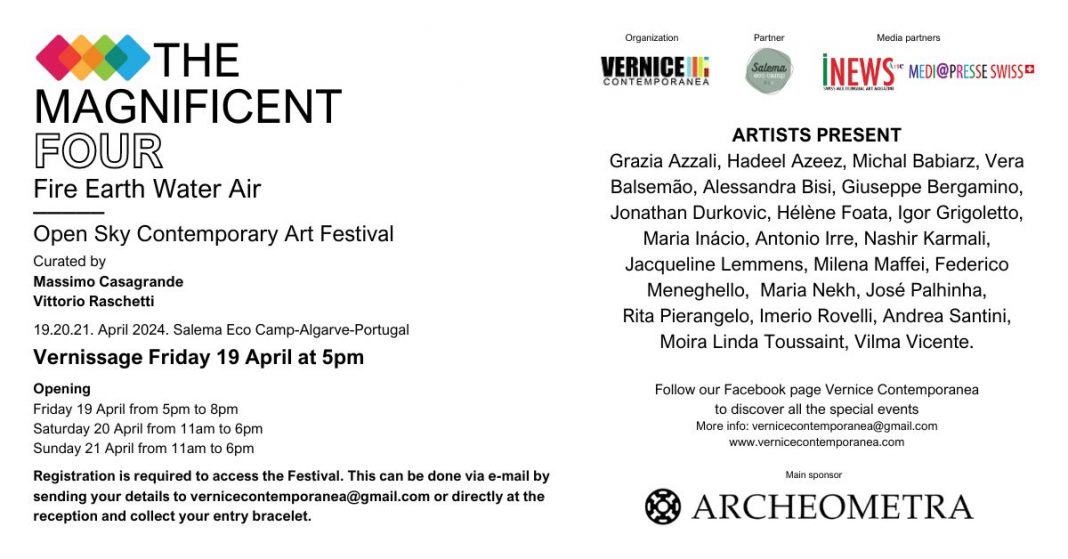 L'Associazione Culturale Internazionale Vernice Contemporanea, in collaborazione con i partners Salema Eco Camp, Archeometra, Mediapresseswiss e Inews, presenta la prima edizione di "The Magnificent Four", un festival internazionale di arte contemporanea a cielo aperto che si svolgerà dal 19 al 21 Aprile nell parco naturale dello stesso eco camp. Il tema del progetto è quello dei quattro elementi naturali: Fuoco, Terra, Acqua e Aria, elementi che caratterizzano la costa meridionale portoghese.