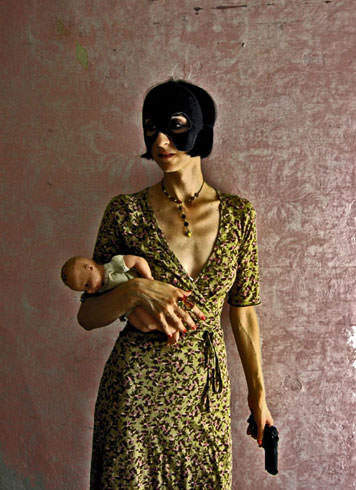 I suoi personaggi dominano la scena, posizionandosi al centro della riquadratura pittorica, caratterizzata da sontuosi fondali in carte da parati dal gusto tipicamente vintage. Figure rappresentative di vite ed identità non perfettamente delineate: non miti, quindi, non eroi, ma esseri imperfetti, icone di una società massmediatica. La maschera come feticcio, va rapportata ad un sistema società, e va letta con toni cangianti ed effimeri.