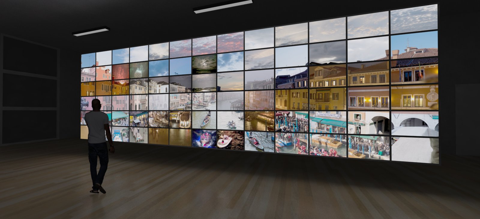 Al Fondaco dei Tedeschi a Venezia l’installazione sarà realizzata da 78 monitor, che si combineranno per formare una molteplicità di immagini dove la veduta è affidata al montaggio variabile, e modificabile quasi all’infinito, dei vari pezzi separati che compongono un paesaggio perfetto e instabile, affascinante e mutevole: contemporaneamente notte e giorno, alba e tramonto ...