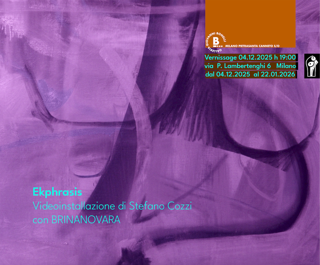 Nella sala attigua alla galleria è proiettato il video inedito Ekphrasis (2025) di Stefano Cozzi, che investiga la dialettica nella pittura delle opere di BRINANOVARA.