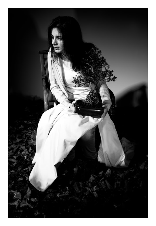 “Un set fotografico semplice, multisensoriale: pareti bianche, un tappeto di foglie a terra, un tavolo bianco, una sedia, un lenzuolo candido. Luci soffuse di colore blu, simbolo dell’autismo, creano un’atmosfera tranquilla e magica. Un regalo sta per arrivare: c’è attesa, anticipazione, apertura di un sorriso imminente. Piccoli alberi nudi offrono la loro geometria come una sorpresa. In mano, interi, perfetti, incarnano la presenza di un incontro, un romantico tête-à-tête di vita con vita, entrambe in trasformazione, ma allacciate in questo luogo lungo il filo di un momento che si protrae. Dialoghi di pelle, suoni, odori che esprimono, più di ogni altra cosa, l’inadeguatezza delle parole.” (La curatrice della mostra, Francesca Bacci)