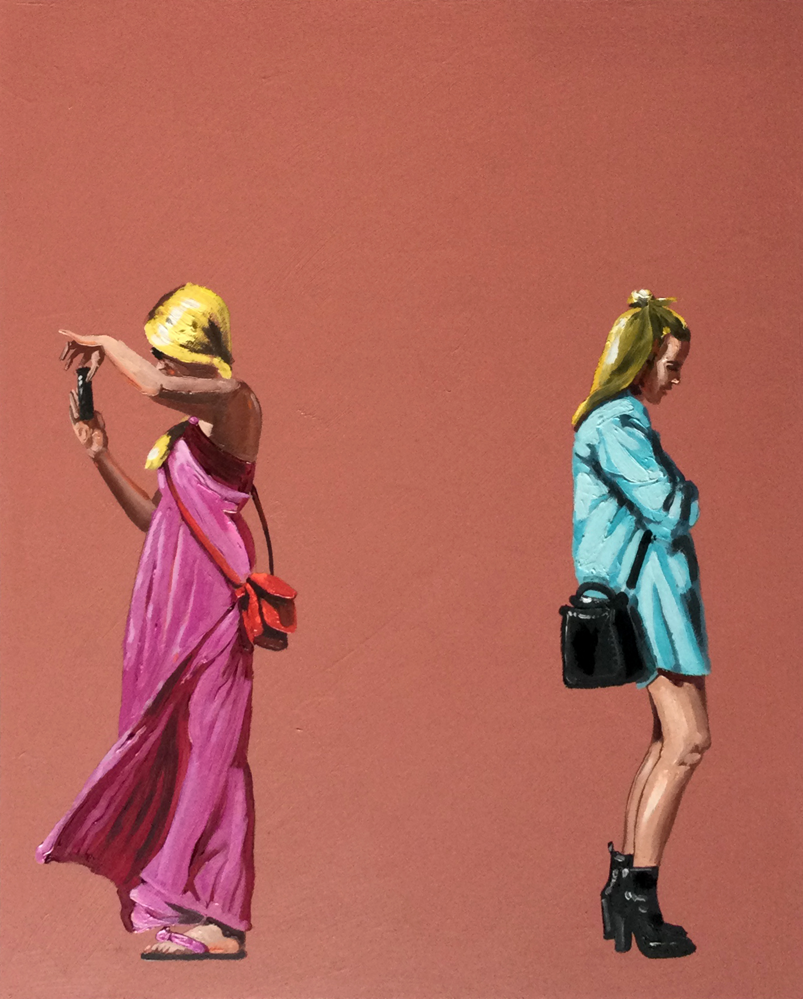 Si avverte un forte senso di familiarità nel soffermarsi sulle opere proposte in mostra: ognuno di noi è stato ed è personaggio di quella folla raffigurata nel passeggiare, nel rispondere e guardare il cellulare, nel fotografare, nell’abbracciare, nel parlare. Sono i gesti che ognuno di noi compie quotidianamente e il fatto che questi soggetti siano realmente esistiti, essendo stati prima fermati in una immagine fotografica, e poi sapientemente dipinti ad olio su tela conservandone l’iniziale spontaneità e movimento, ci invita all’immedesimazione.