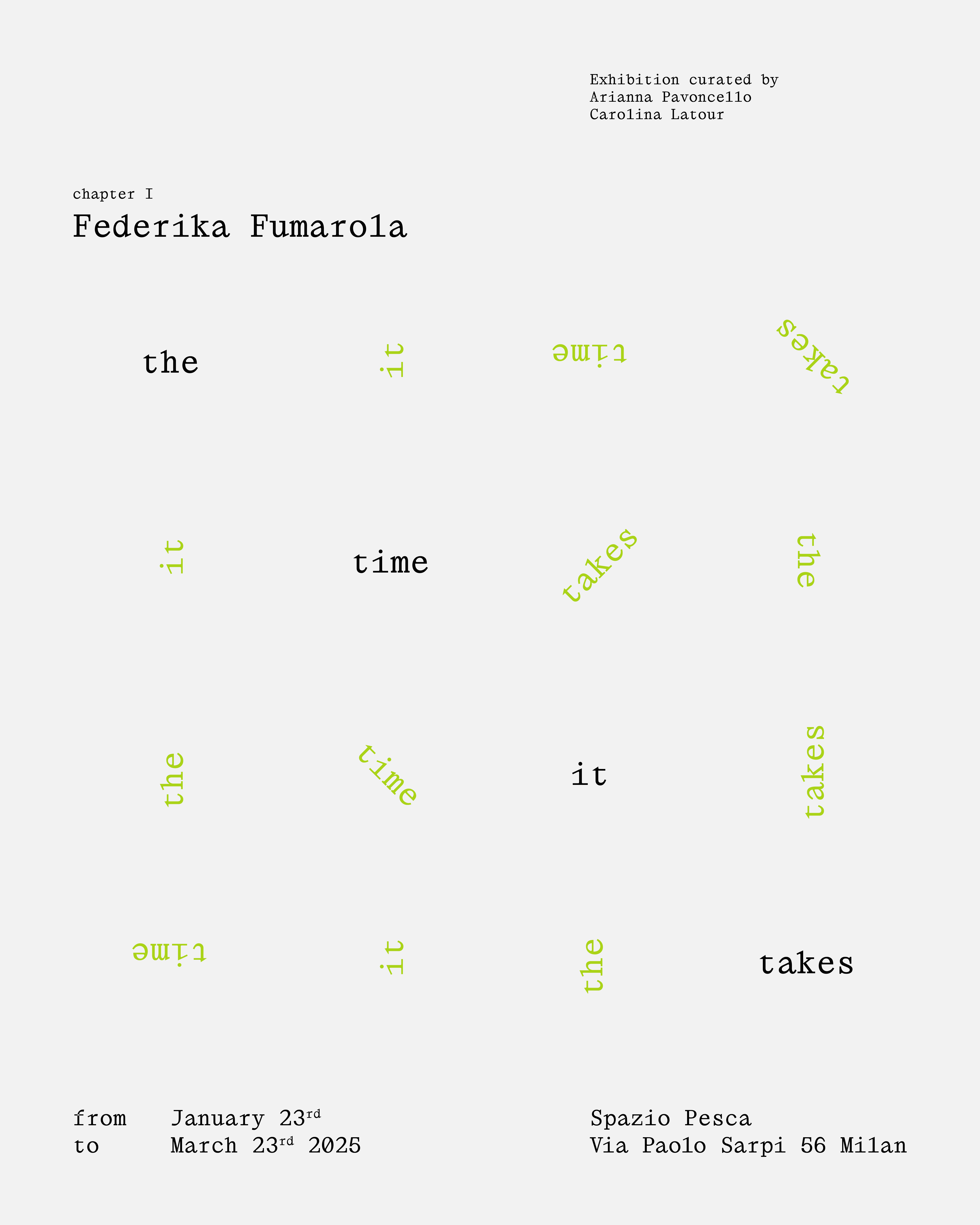 Studio Pesca presenta the time it takes, un ciclo di mostre ospitate da Spazio Pesca a cura di Arianna Pavoncello e Carolina Latour, che esplora il rapporto tra il tempo, la creatività e la complessità della produzione artistica contemporanea.