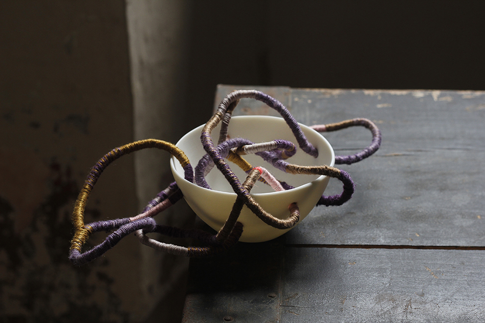 La fiber artist italiana Michela Cavagna, nella sua installazione "The Impossible Tea Party" di tazze da tè deliziosamente allettanti, elimina la possibilità di godersi la porcellana fine, scopo per cui è progetta, poiché le tazze non solo hanno buchi ma sono attraversate da fili colorati aggrovigliati.