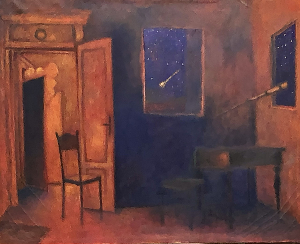 Olmo Gasperini, nato a Roma nel 1997, si è laureato in Pittura all'Accademia di Belle Arti di Brera a Milano nel 2021 e sta ora completando un programma post-laurea. Gasperini è attualmente concentrato sulla rappresentazione di interni: spazi solitari e notturni, dove finestre che incorniciano cieli stellati rompono l'atmosfera claustrofobica. Il suo ultimo dipinto, incluso in questa mostra, è incentrato su una figura femminile sobria che affronta lo spettatore, attirandolo nel suo spazio riccamente colorato. Il lavoro di Gasperini è già stato esposto da note gallerie a Milano e Bologna.