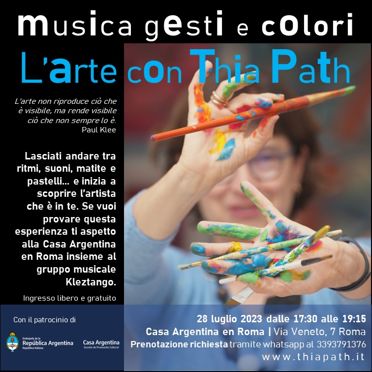 La Casa Argentina en Roma è lieta di presentare l’artista italo-argentina Thia Path che, dopo aver esposto le sue opere a Milano e Piacenza, arriva per la prima volta a Roma. La mostra, intitolata "Into the Colors", si ispira ai grandi maestri dell'espressionismo astratto del Novecento, ma si distingue per una palette di colori personalissima, energetica e unica. I colori utilizzati nelle opere di Thia Path vibrano, esplodono e si muovono, grazie all'uso di pastelli, rulli, pennellate e sgocciolamenti.