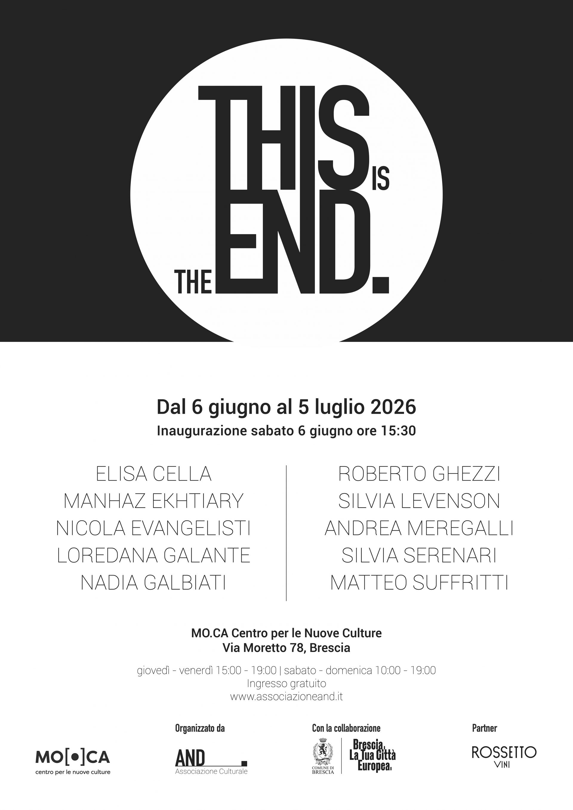 Monza, maggio 2026 – AND Ente del Terzo Settore presenta dal 6 giugno al 5 luglio 2026, nello Spazio espositivo del MO.CA - Centro per le Nuove Culture di Brescia, la mostra collettiva This Is The End che riunisce le opere degli artisti: Elisa Cella, Nicola Evangelisti, Mahnaz Ekhtiary, Nadia Galbiati, Loredana Galante, Roberto Ghezzi, Silvia Levenson, Andrea Meregalli, Silvia Serenari e Matteo Suffritti.