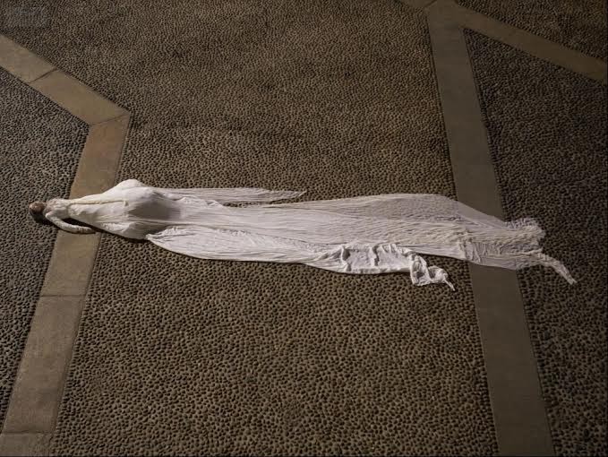 in cotone, seta e lana. La scultura tessile sarà quasi completamente bianca con un particolare rosso, colore utilizzato dall’artista in tutte le sue opere. Altri wrapping saranno di vari colori. I soggetti, inizialmente immobili, in piedi, con gli occhi chiusi, modificheranno le loro posizioni attraverso