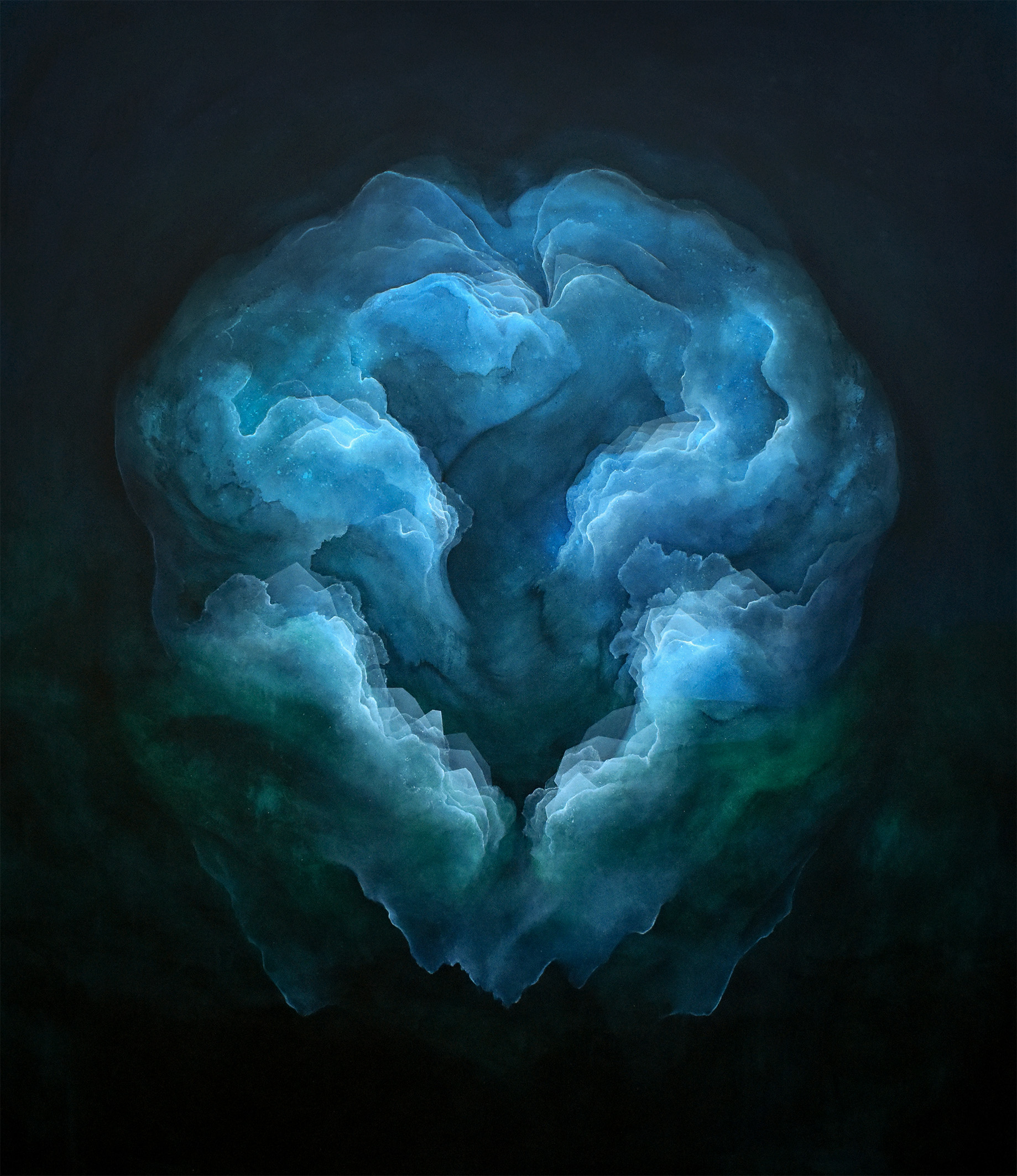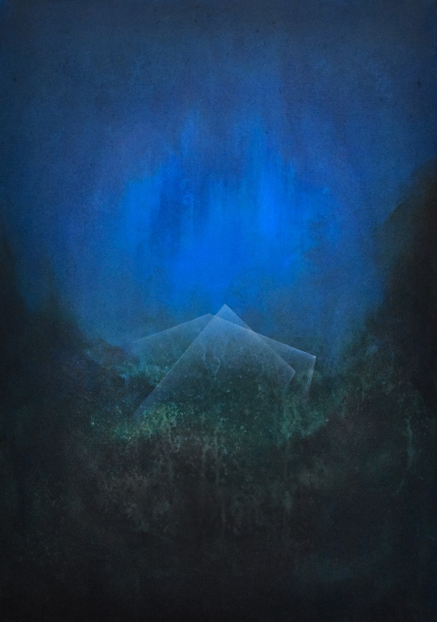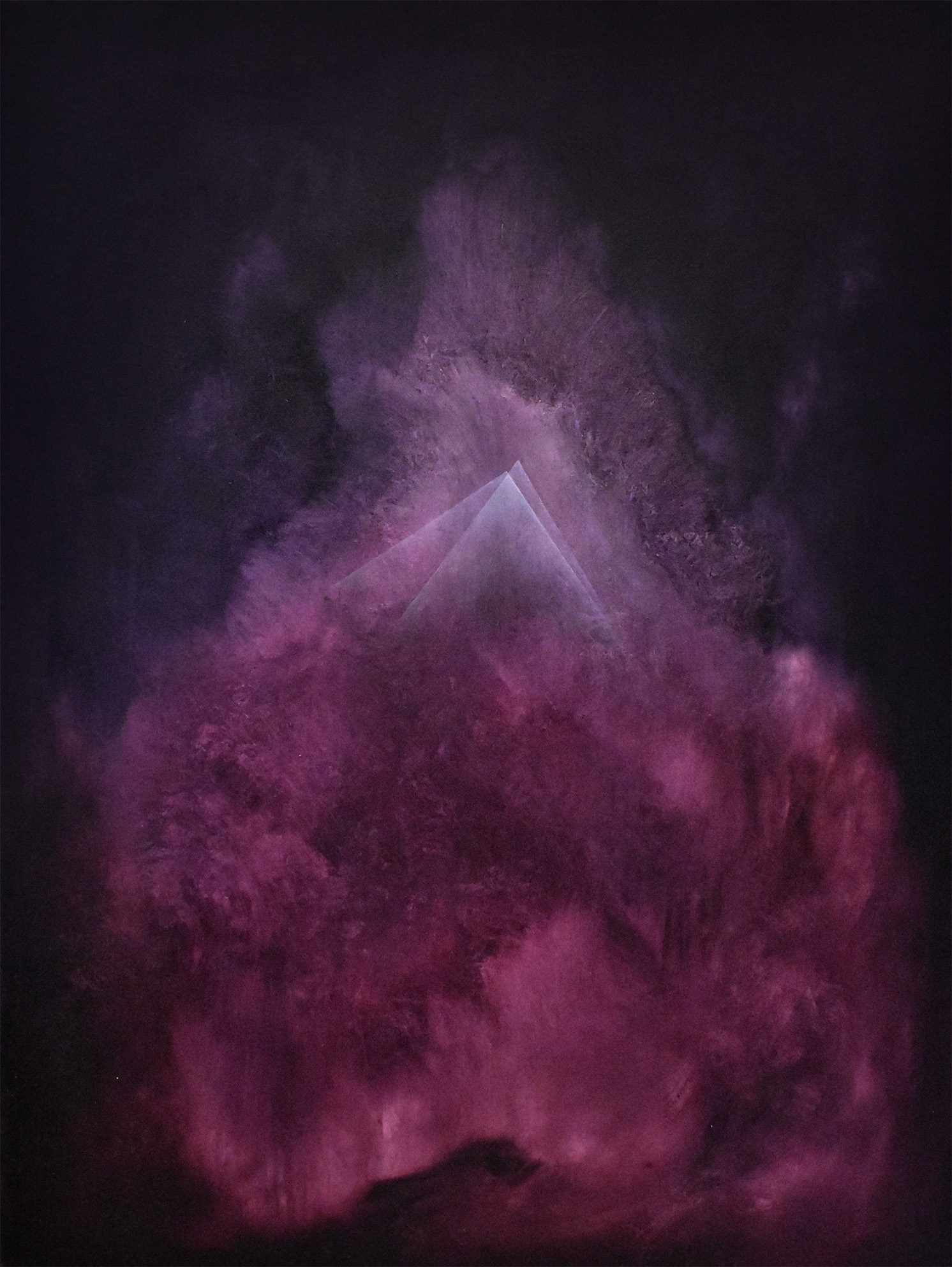 I dipinti di Thomas Scalco appaiono come delle fugaci visioni, in bilico tra due realtà, in cui forme in mutazione geometrica si fondono con la natura in un gioco di rimandi. Attraverso la sua pittura, l’artista cerca l’equilibrio tra l’onirico e il tangibile.