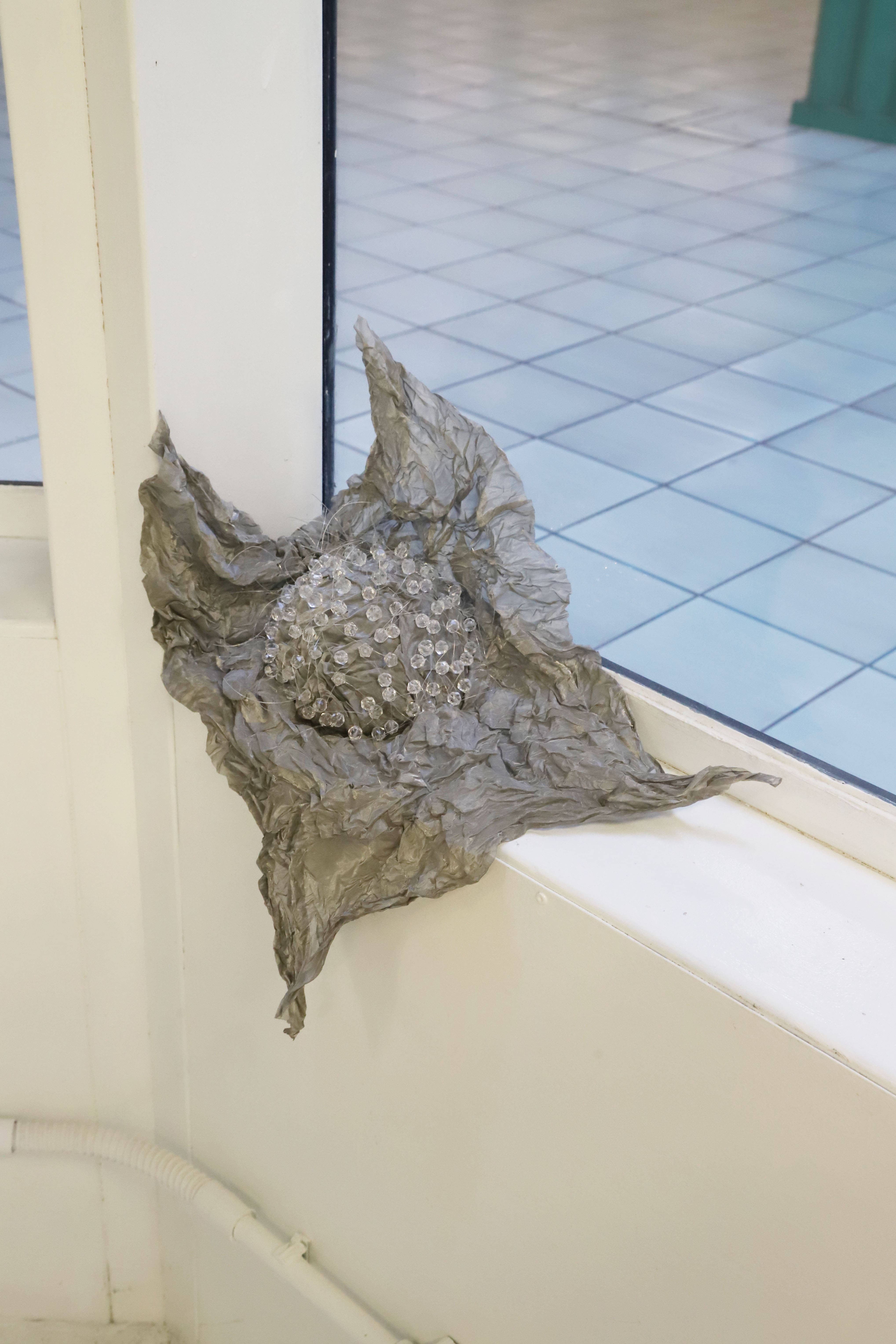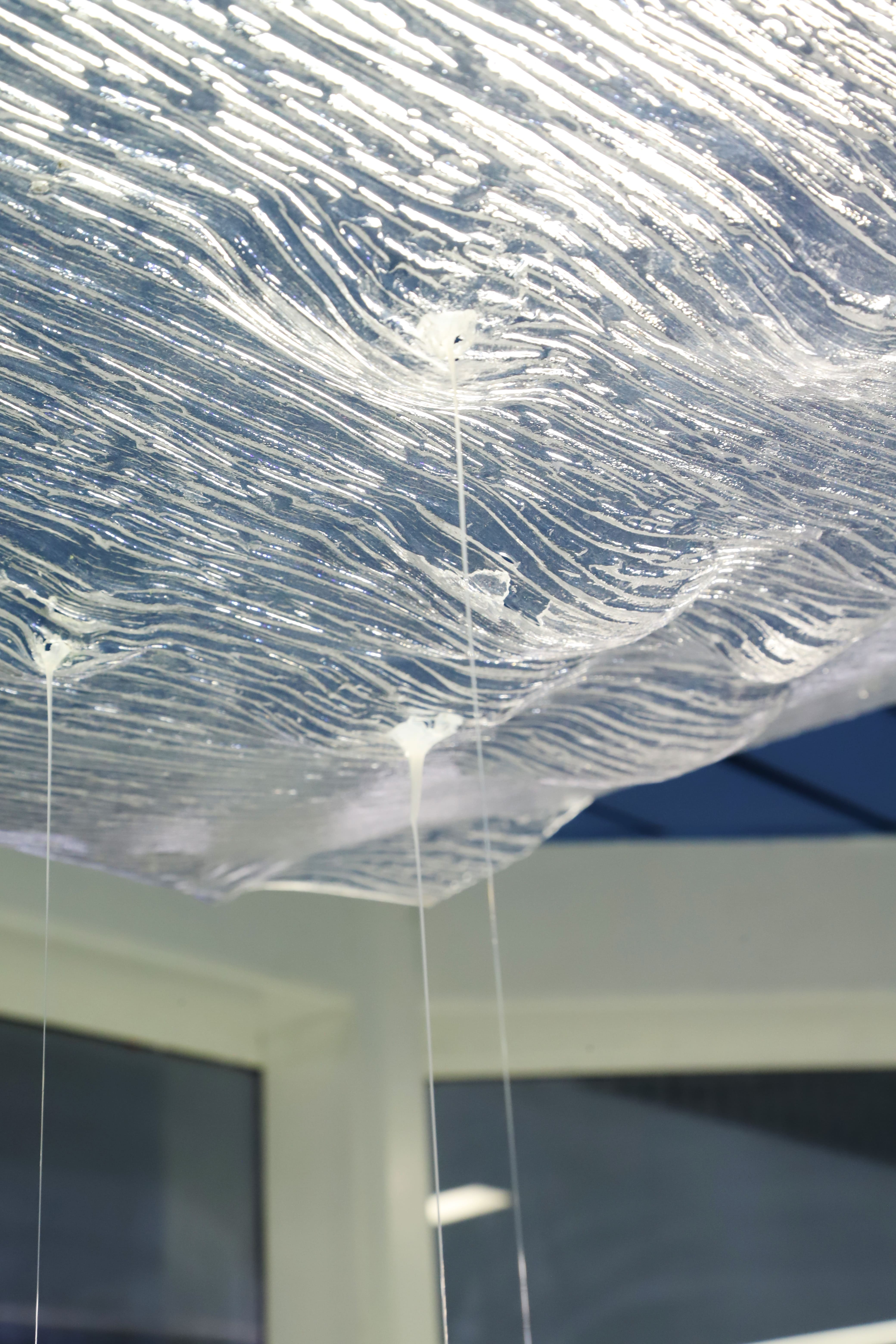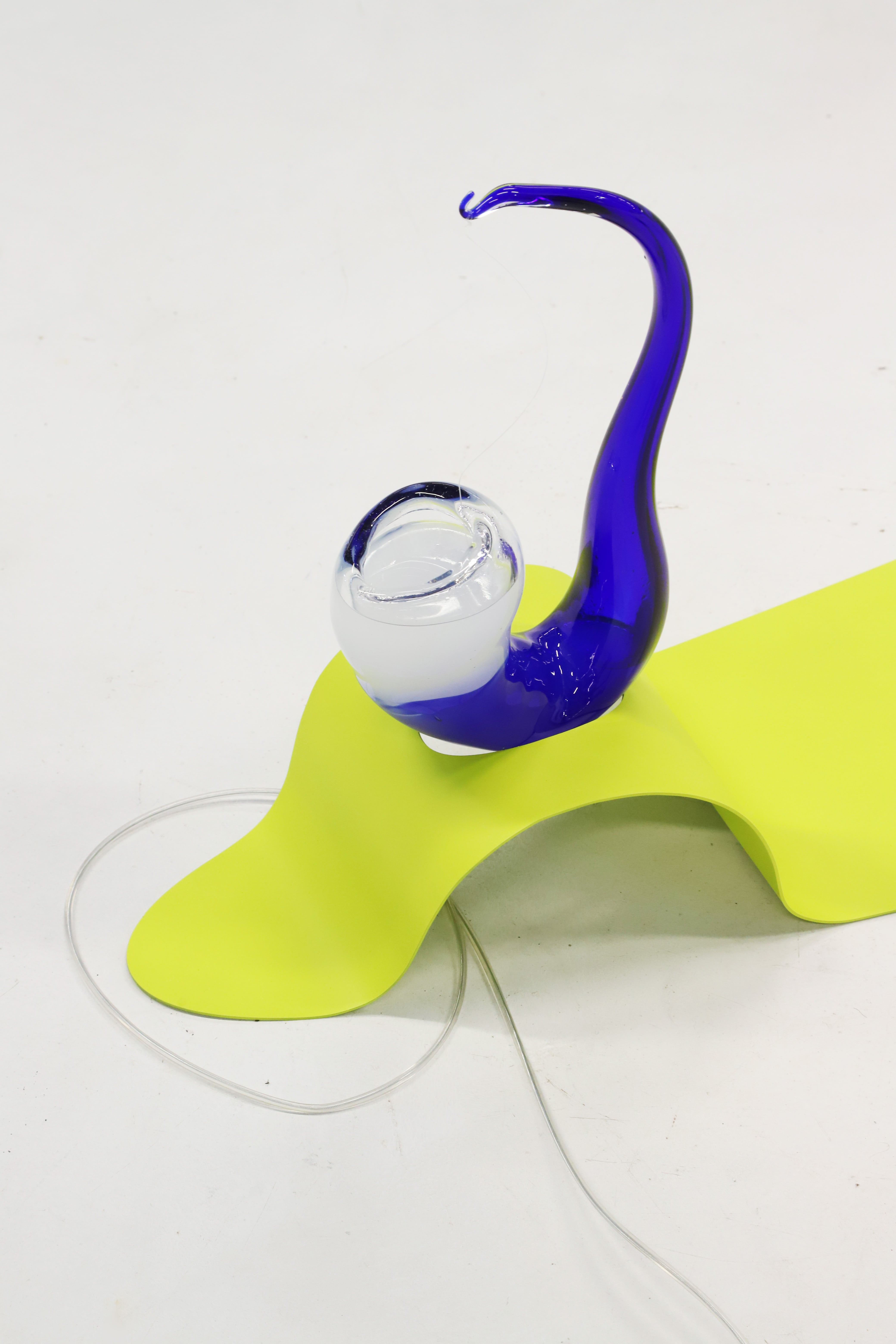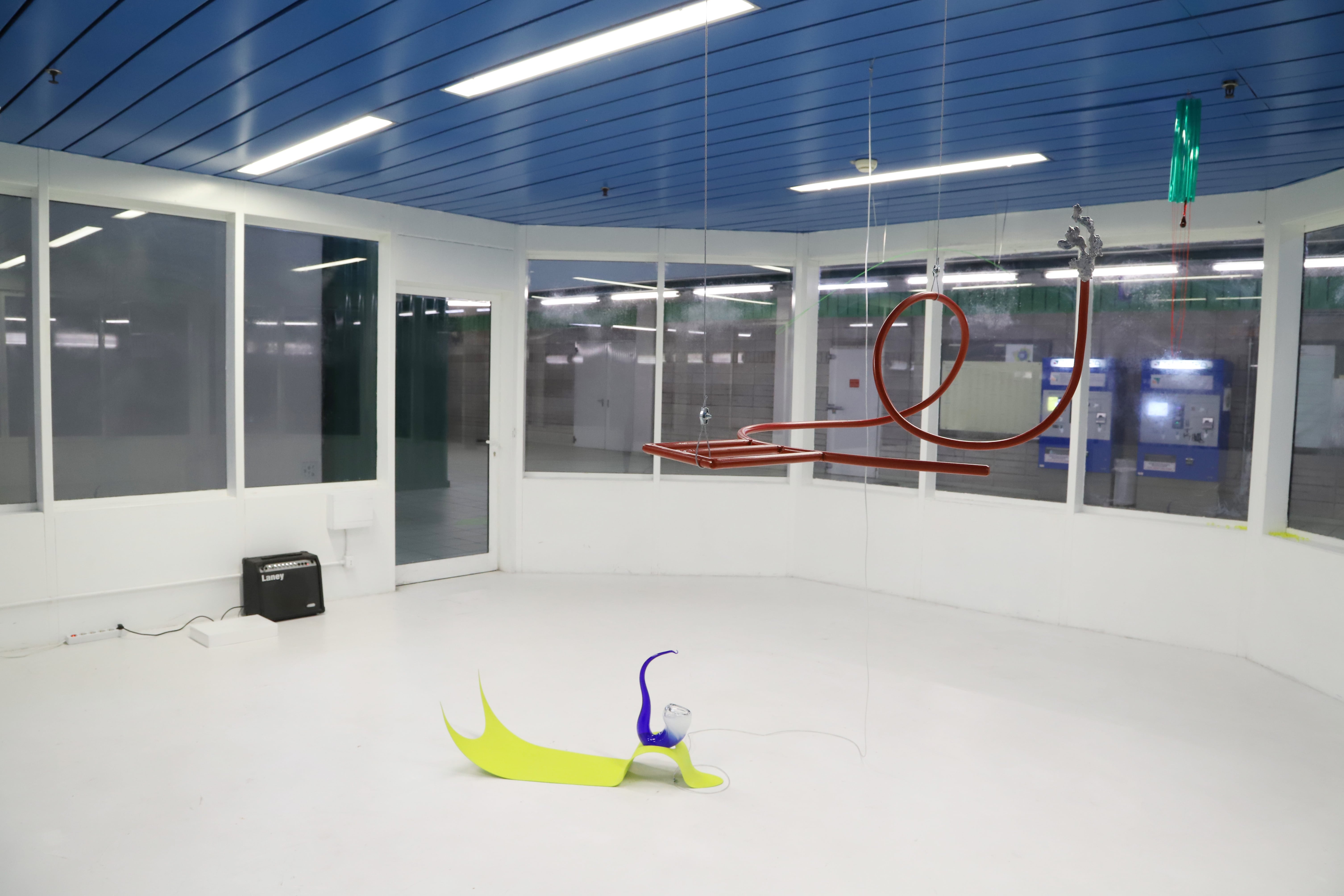 spazioSERRA diventa un ambiente acquatico capovolto, in cui il soffitto blu prende il posto del fondale e le vetrate simulano la presenza di acqua: come in un ambiente immerso, forme e colori delle opere sono visibili in modo offuscato. Due tracce audio di diversa durata vengono riprodotte in loop con un ritardo progressivo, creando un ambiente sonoro in costante mutazione per tutta la durata della mostra: suoni provenienti dai fondali marini si intersecano con suoni del paesaggio ferroviario. L’altro elemento mutante della mostra è un cristallo, posto all’interno di una scultura in vetro di Murano, contenuta nella pinna, che viene alimentato da una soluzione chimica che ne determinerà l’aumento di dimensione, in modo costante ma molto lento, tanto da sembrare invisibile.