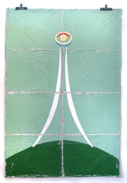 On this occasion the paintings use exactly the same emblem, a sort of iconic monument or totemic construction whose colour varies with the season and the time of day, and in this way opposes the inevitable ravages of time. These works continue the series of progressively numbered paintings grouped under the title United in Different Guises. Proposing as they do a dual function, with a role of representation as well as communication, at the root of their imagery lies an intentional fusion of signs and design, a visual strategy that is then recomposed and codified under a more generically symbolic appearance. Through technical devices such as the bending of the support, the scratching and the progressive and gradual aging of the surface and the colour, the painting itself is transformed into a succession of functional propositions. What is offered to the gaze is in the end an object that brings into question the notions of symbolism and authenticity, allowing the final image to go beyond the confines of painting itself.