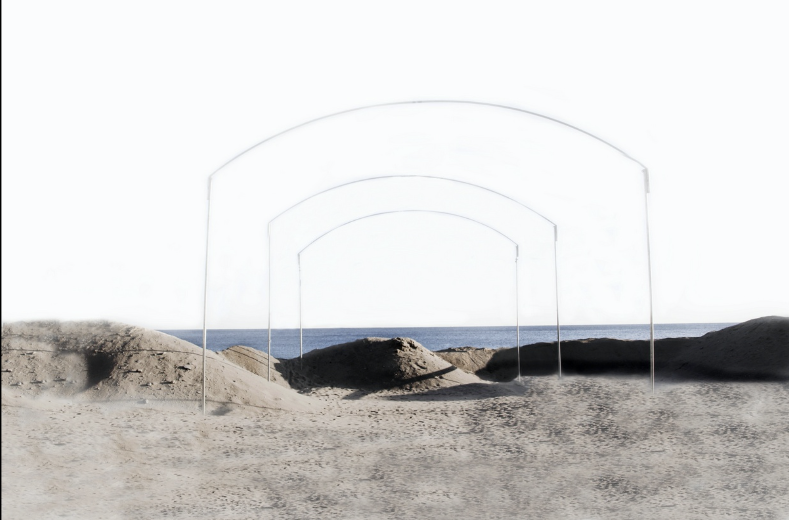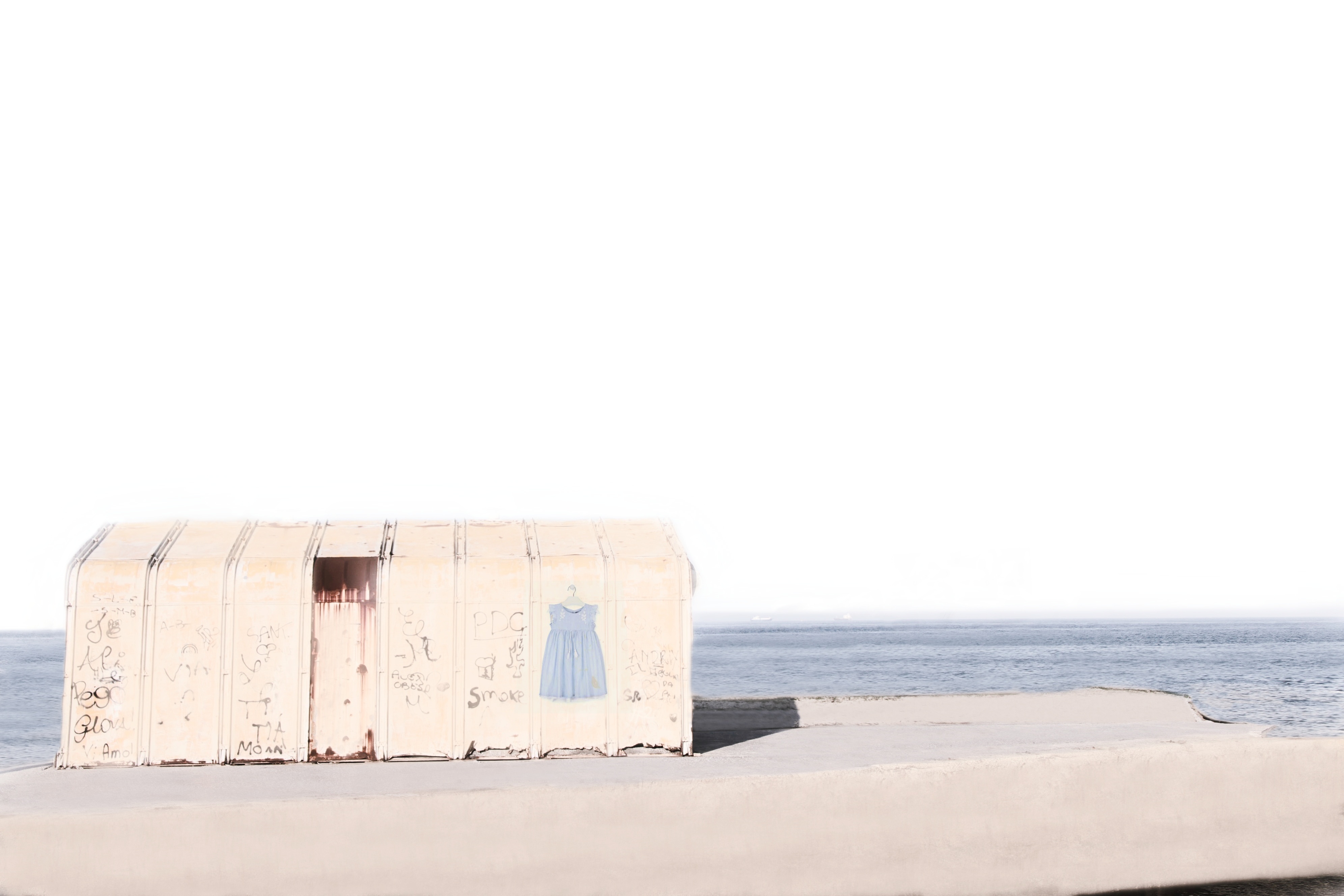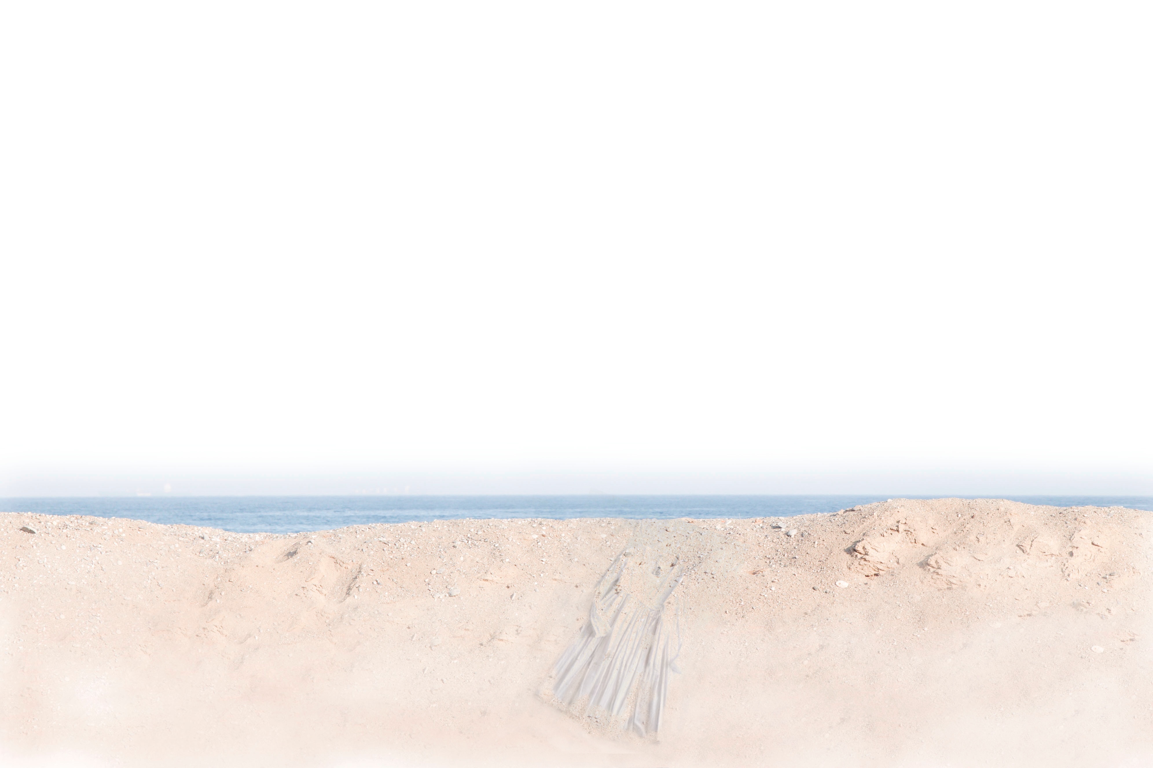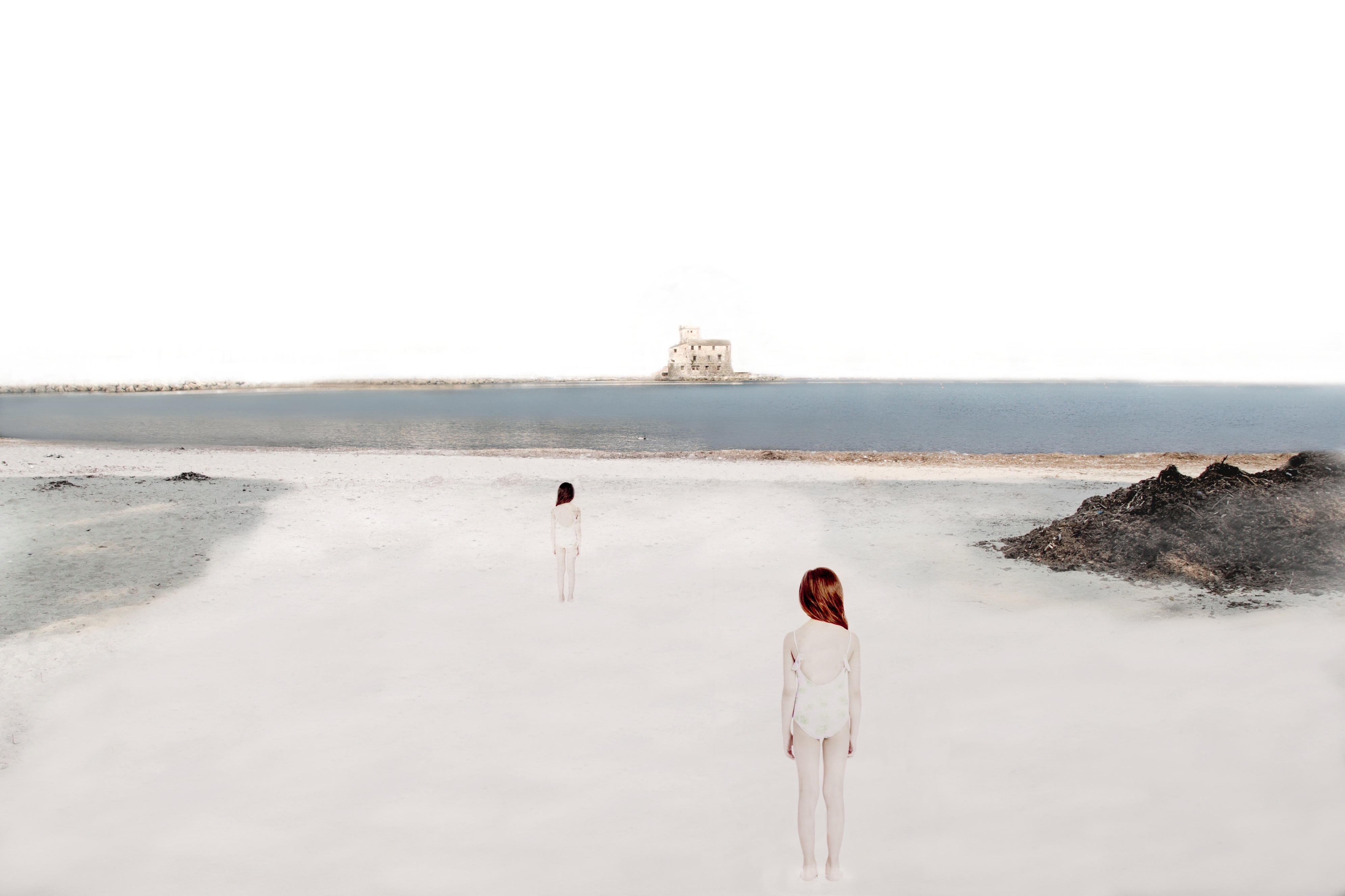 Sopravvivono nei lacerti di abiti dimenticati, le presenze di corpi viventi che, un tempo, hanno abitato spiagge disossate. Forse lì giocava una bambina. Ora è un’immagine sbiadita, riflessa nel suo doppio. Nel tempo la sabbia inghiottirà tutto… tranne i ricordi.