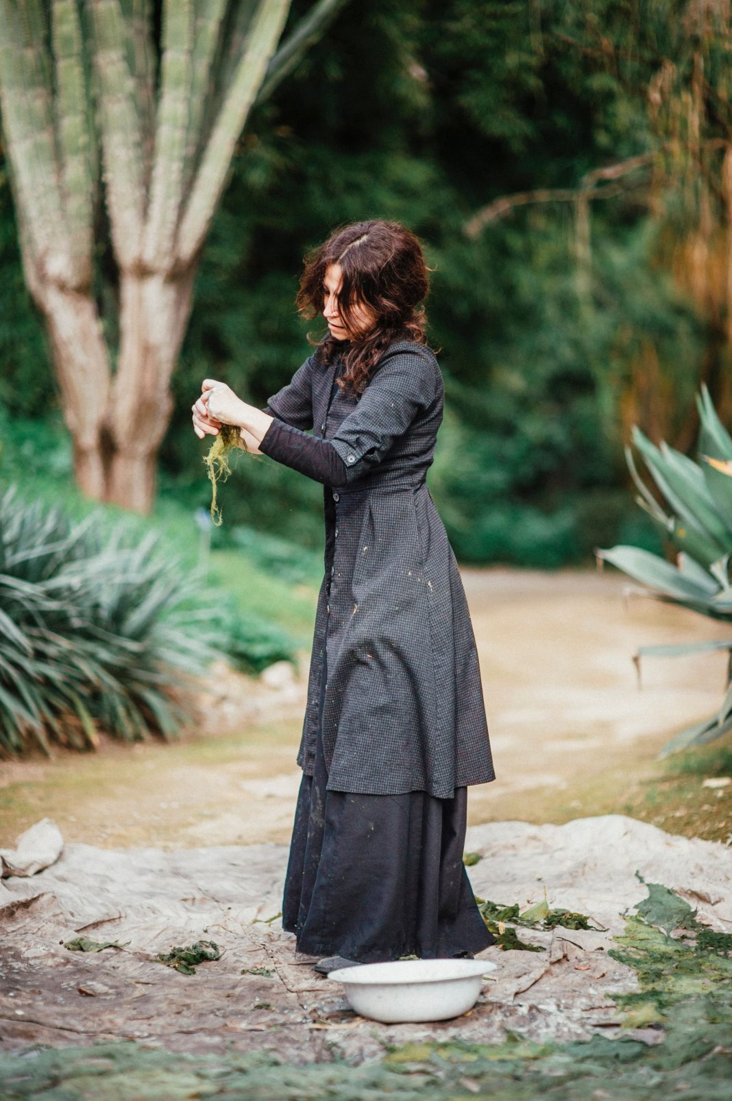 Non sprecando materiale e non usando agenti chimici, l’artista ha lavorato con la massima attenzione verso l’ambiente e l’ecosostenibilità, recuperando materiale organico dismesso dall'Orto stesso, come alghe, foglie, fango, e indossando per tutto il periodo della residenza lo stesso lungo abito nero realizzato su misura con una stoffa solida come una corteccia protettiva.