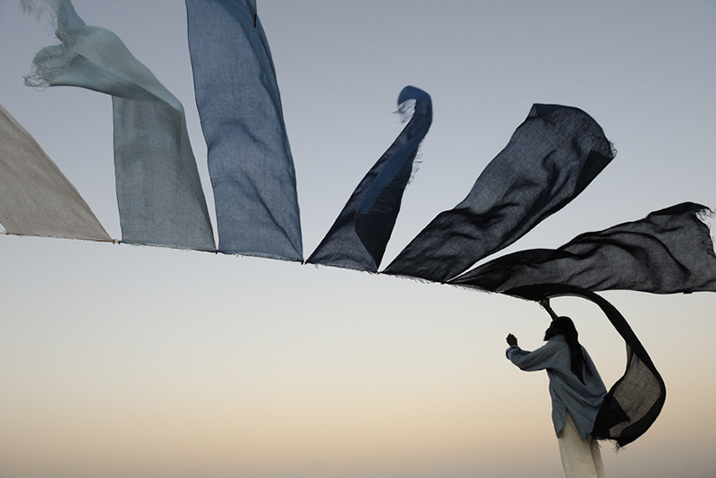 “Le storie che raccontano – dice la curatrice - vanno in alto come il ventaglio di sciarpe nei diversi colori dell’indaco a guardare il cielo. Aboubakar Fofana, maestro dell’indaco, creatore di tessuti e artista contemporaneo, cercato e fotografato con maestria da Tiziana e Gianni Baldizzone, rilascia particelle della sua anima in quel gesto proteso a confrontare i colori dell’indaco con i colori del cielo, incantato dalla luce del tramonto. Artigianato? Mondo antico e perduto? No. Modernità che irrompe e crea e si moltiplica”.