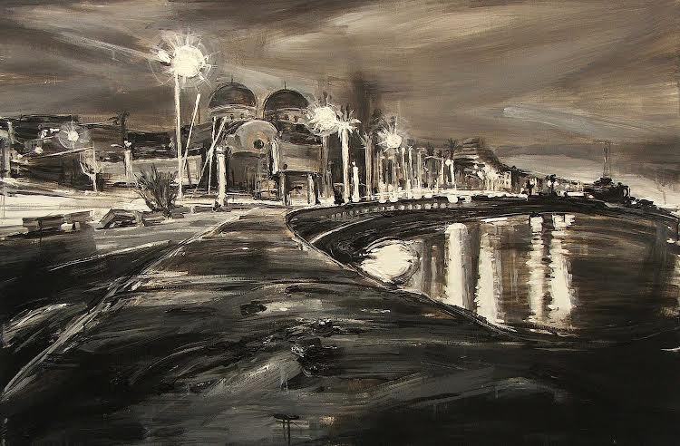 pittorico molto gestuale, vibrante, detta una velocità ai palazzi, alle carreggiate, alle volumetrie delle