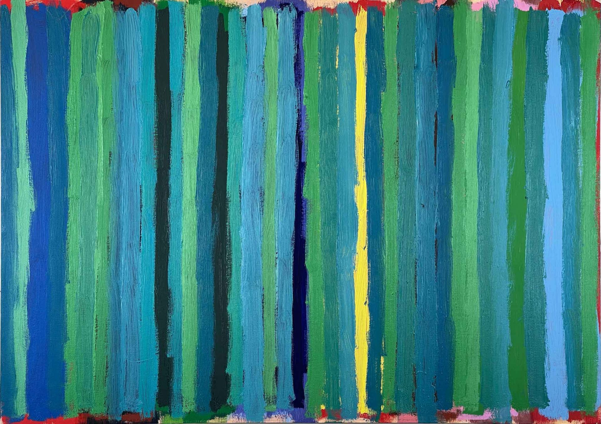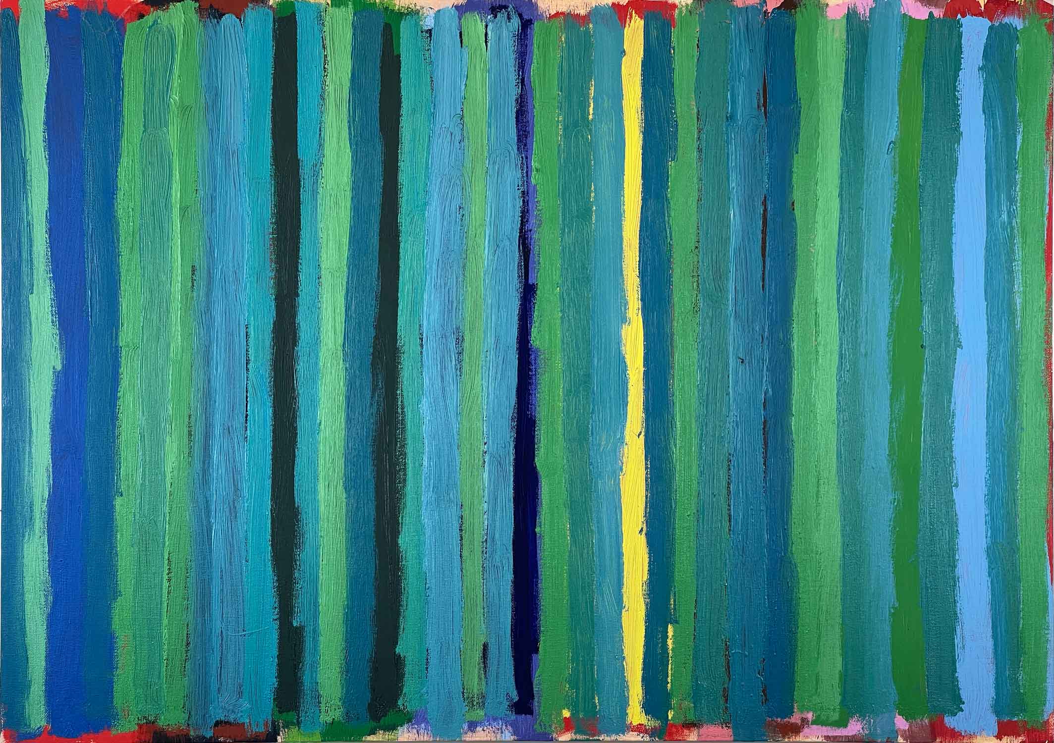 Tiziano Bellomi, come in un rituale, incentra il suo lavoro sul colore e le geometrie. Nei suoi dipinti l’artista interviene con ripetute stesure di strisce verticali affiancate di colore, un colore puro e intenso.