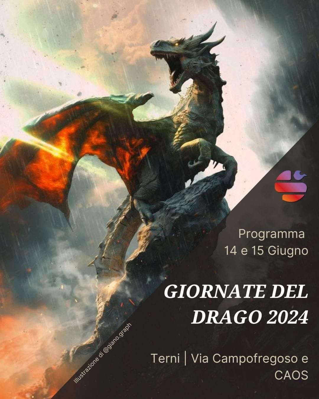 Tra gli appuntamenti “La Notte del Drago” 14 Giugno Bside del Caos. Una prima inedita conferenza spettacolo, tra reading, proiezioni e performance musicali una sorta di happening orizzontale e circolare tra i partecipanti al fine di stimolare la partecipazione attiva e danzante del pubblico. Va da sé, incentrata sulla chimera Drago nella sua formula sapienziale orientale, di opposti che si compenetrano, di un Ensō di calligrafia giapponese e uroboro alchemico; ovvero la possibilità di trasformare una condizione proposta da Saverio Bafaro. Il 15, “Il salotto esoterico" di Carlo Dorofatti presso la Libreria Laurentiana di Terni: “Simbologia alchemica del drago.