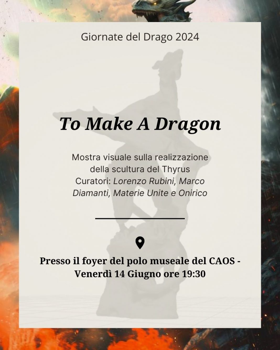 Tra gli eventi che coronano il varo della scultura : ‘To Make a Dragon’ OPENING 14 Giugno nel foyer del CAOS Centro Arti Opificio Siri, contestuale alle Giornate del Drago presso la Sala dell’orologio del Museo CAOS che si presentano come la summa dei racconti attorno al Drago.