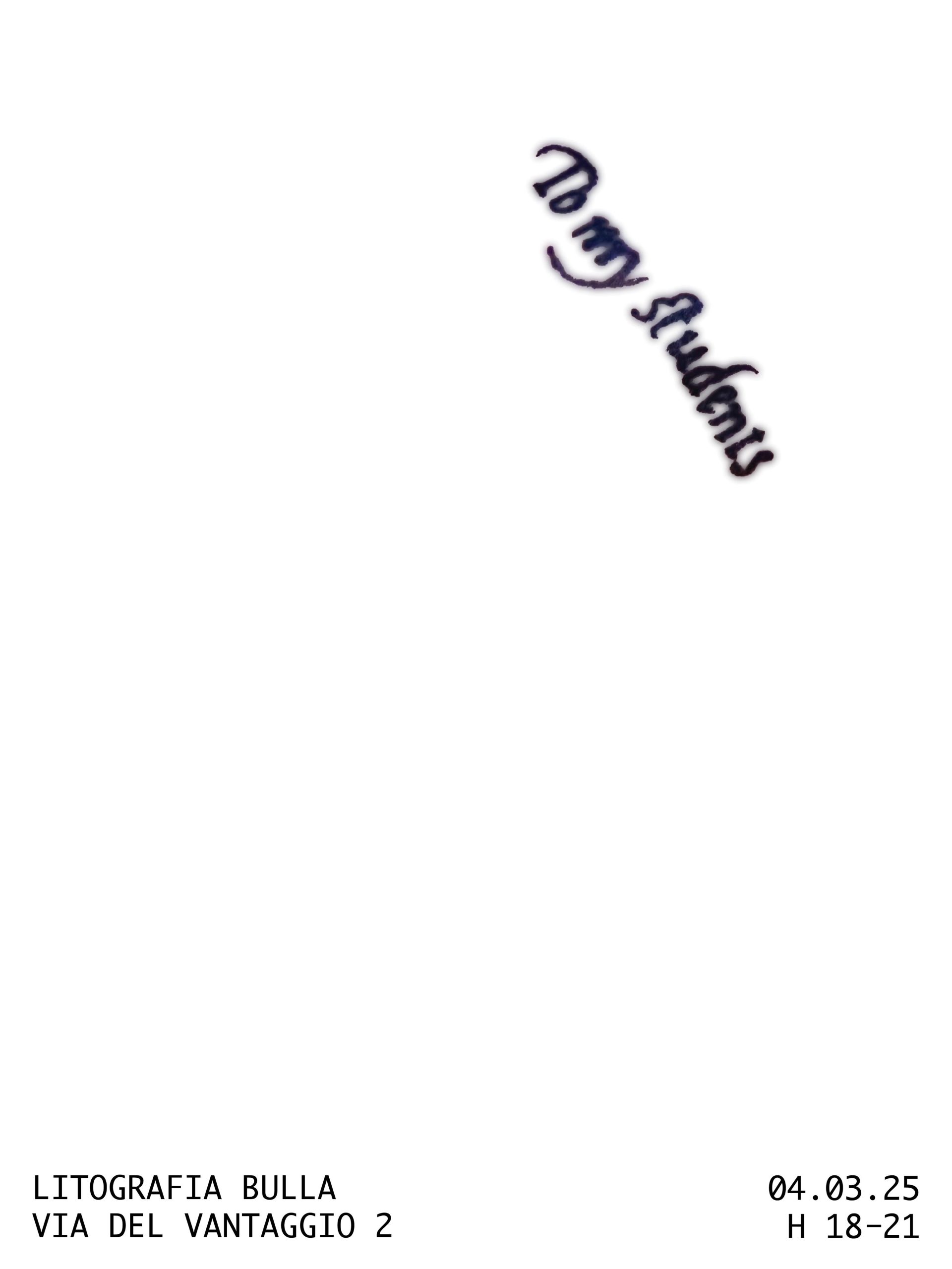 Il 4 marzo dalle 18.00 Litografia Bulla ospiterà la presentazione di To my students, un progetto editoriale e performativo di Federico Arani, Enrica Arbia, Marco Ceccarelli, Giulia Crivellaro, Ginevra Collini, Giorgia Errera, Vito Gara, Andrea Lo Giudice, Alessandro Matera, Andrea Mauti, William Pilé, Stella Rochetich, Ariell Zéphir, con la partecipazione di Paolo Canevari.