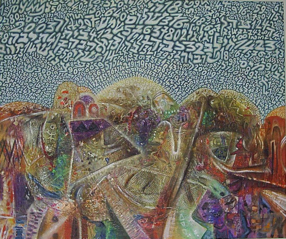 La logica alfa-numerologica, che sottende le opere di Ravà, è intesa come codice binario in quanto, secondo la posizione occupata dalla cifra all’interno della tela, il numero assume un valore diverso in base alle regole della ghematria (criterio di interscambio delle 22 lettere che compongono l’alfabeto ebraico in numeri, in cui ogni lettera corrisponde ad un numero così che ogni successione alfabetica può considerarsi una somma aritmetica). Tale linguaggio codificato raccoglie inoltre elementi linguistici e filosofici che vanno a costituire una sorta di magma pittorico fatto di lettere e numeri che tendono a formare sulla superficie della tela: boschi, volti, fughe, vedute, portici.
