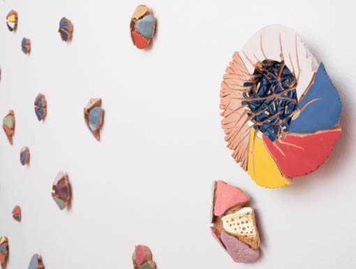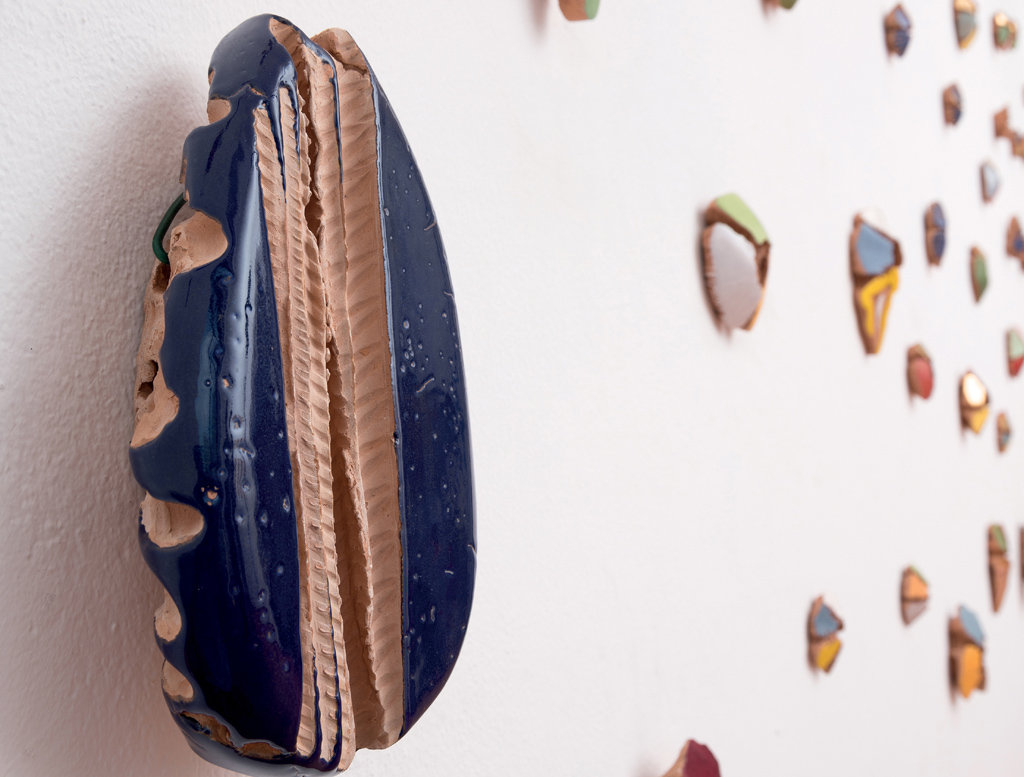 Spiazza e sorprende L’ Albero del Miele (2023), composta da una forma rettangolare dorata affiancata da un quadrato blu cobalto, forato che evoca i buchi di Lucio Fontana, in cui fa capolino una minuscola finestrella che incornicia un micro albero del miele dorato, simbo-