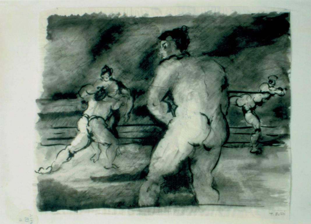 Chiamato a Tokyo nel 1954 per ristrutturare l’edificio dell’ambasciata italiana, Buzzi durante il suo soggiorno traccia su carta immagini ed esperienze del Paese del Sol Levante: decine di fotogrammi, ciascuno a significare un pezzo del percorso, un’idea, un pensiero, una visione fissata nella mente. Sovente ripete un medesimo soggetto, ma con un linguaggio sempre nuovo che risponde alla sua sensibilità incandescente ed aperta. Immortala, col segno vibrante, nervoso, inquieto che lo caratterizza, i lottatori di sumo, lo sport nazionale giapponese, le cui origini risalgono agli inizi del VI secolo. Colti nelle diverse pose plastiche, che li rendono leggeri nonostante il peso specifico dei loro corpi, i lottatori di Buzzi indossano tutti il mawashi e i loro capelli sono acconciati con la particolare crocchia detta oi-cho mage. Nel percorso espositivo, i lottatori stanno al fianco di un’altra immagine simbolica del Giappone, quella delle maschere teatrali. Buzzi ci consegna una carrellata, intensa e pregnante, delle maschere kabuki della tradizione oriundo-nipponica. E ne sottolinea, con grande efficacia di tratto, il loro aspetto popolare. Il Teatro Kabuki infatti è una forma di drammaturgia giapponese dell’inizio del ‘600 – formata da tre ideogrammi: “ka” (canto), “bu” (paura), e “ki” (identità) – che rappresenta per molti la volgarizzazione del ben più nobile Teatro Nō – dall’ideogramma “nō” (abilità) –, nato nel ‘300 e che presuppone una cultura elevata per essere compreso.