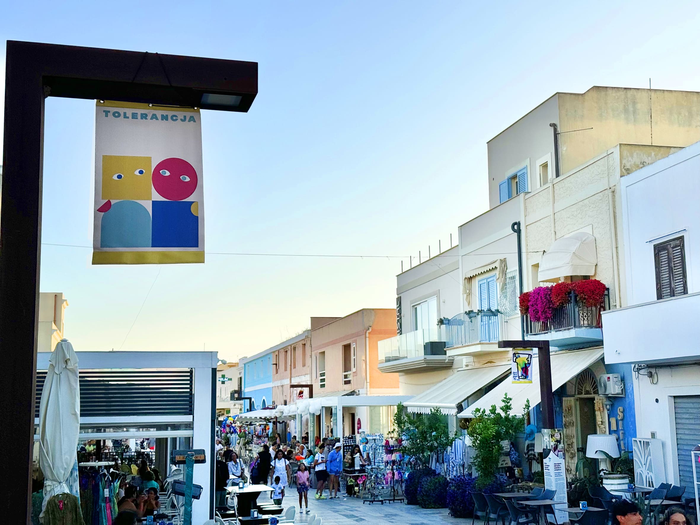 Tolerance Project a Lampedusa è un'installazione diffusa costruita a partire dalla “topografia” dell’isola con stendardi e bandiere su cui sono riprodotti i manifesti che accompagnano il cammino di residenti e visitatori. Una galleria a cielo aperto, capace di intrecciare l’estetica del progetto con una delle zone più frequentate dell’isola. Un progetto che mette in rete più realtà geograficamente distanti ma accomunate da simili dinamiche di frontiera: luoghi in cui storia, cultura e migrazione si intrecciano e generano nuove forme di convivenza.