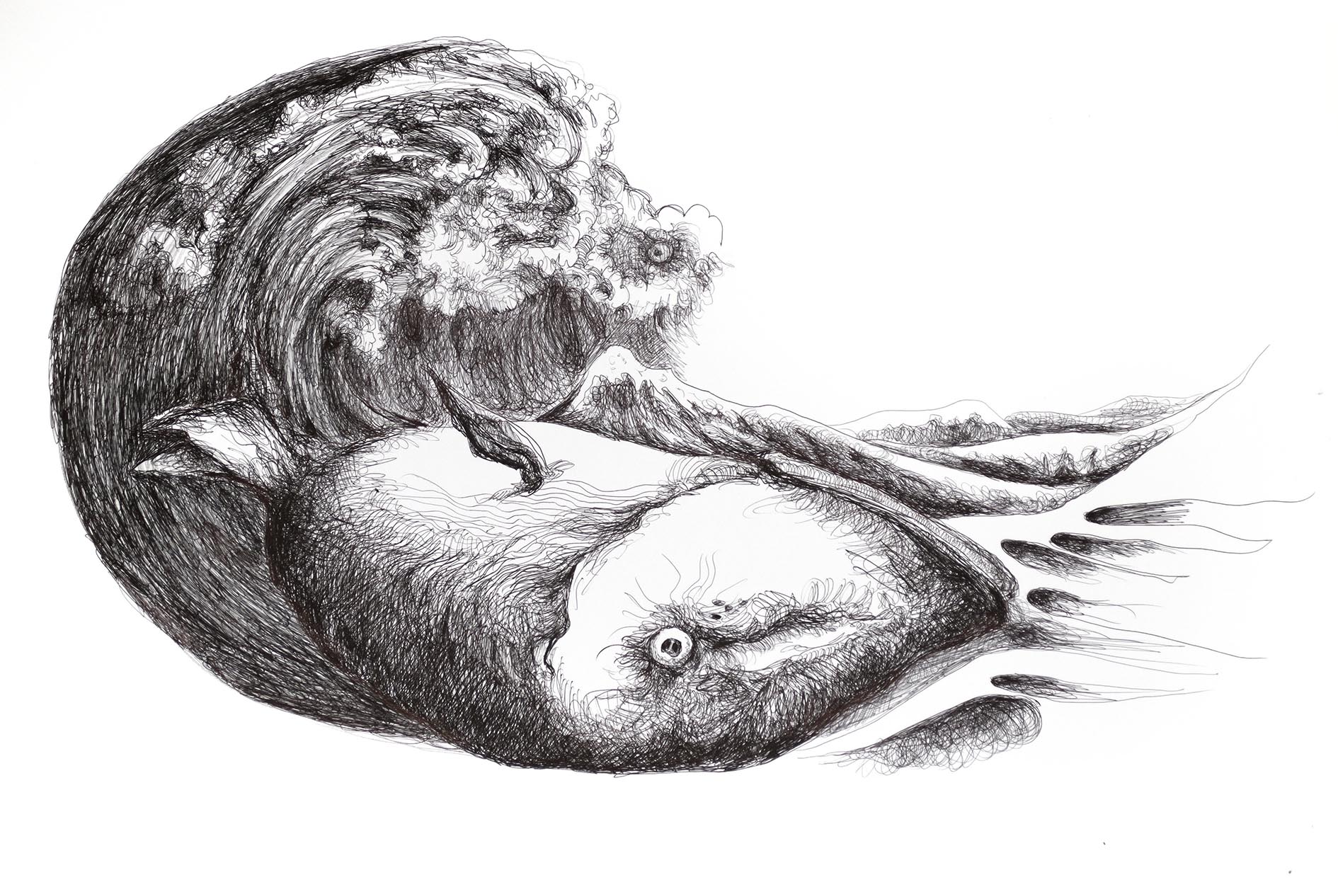 Poeet’s works, which are made with a biro pen on paper or canvas, are a representation of a continuous stream of consciousness in the likeness of the uninterrupted contours he threads together. Swerving between anatomy and abstraction, the depth of the images comes out in intricate, delicate lines that emerge as eyes, faces, wells, roots, trees and landscapes. The works give the viewers an opportunity to immerse themselves into a never-ending explorational journey of Poeet’s fantastical world. Encompassed within this surreal universe are creatures and elements of nature formed through disturbing arrangements where one comes out from the other, touching upon reality yet uncannily real. It is as addictive to look at the works as it is repelling. The true characters of the monsters and the frightening environments Poeet produces - are as unidentifiable as the artist himself.