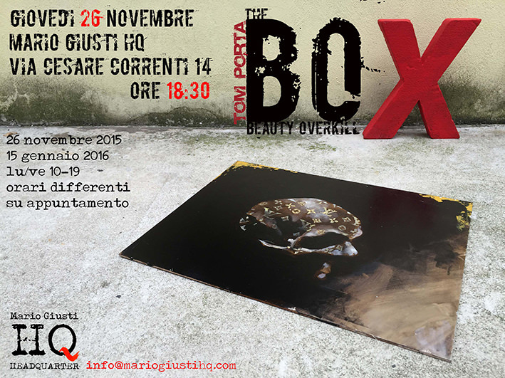 Diceva Enzo Cucchi: «il teschio non è una cosa spaventosa, è solo un elemento primario, elemento di conoscenza, la cosa più vecchia e tranquilla che abbiamo». Questo, principalmente, è il motivo del ritorno a Milano di Tom Porta, alla Galleria Mario Giusti HQ-HEADQUARTER, con una grande installazione di sessanta opere, questa volta di piccolo formato (40x50cm), dal titolo THE BOX, Beauty Overkill: presentarsi appunto con un lavoro “tranquillo” che scaricasse un po’ la fatica fisica e psicologica accumulata con la grande mostra per il Centenario della Guerra Mondiale, Inferno 1914/1918, tenutasi per ben due mesi, con un successo straordinario, al Famedio di Milano, da aprile a giugno.