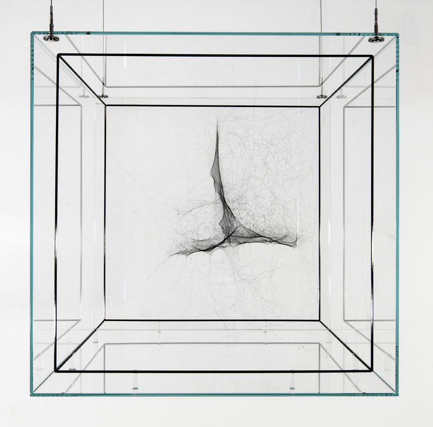 Anche nella mostra Dark Cosmic Web, come in tutta la sua opera, Saraceno con i suoi ibridi di ragnatela, effetti causati dalla collaborazione indotta in successione tra ragni di specie diversa, restituisce un modello olonomico del cosmo. Con l’introduzione del suono, presentato per la prima volta nella mostra personale Cosmic Jive (2014), al museo d’arte contemporanea di Villa Croce a Genova, accompagnata da un libro con contributi disciplinari altrettanto screziati, Saraceno ha trasformato lo spazio vuoto dell’universo, in un pieno pervasivo e denso d’informazione vibrazionale. Suoni che disintegrano il tempo lineare come si può distruggere l’illusione generata da un’interferenza, provenendo da un altrove così remoto in termini spazio-temporali, da apparire inimmaginabile. I suoni che Saraceno campiona per creare la sua “sinfonia mondana”, sono quelli carpiti, con strumenti sofisticati da biologo, dai ragni che, per scopi diversi, dalla caccia all’amore, pizzicano la ragnatela come fosse un’arpa, mixati poi, con quelli registrati delle agenzie spaziali. Proprio lo scorso febbraio l’osservatorio Ligo, ha rilevato per la prima volta un’onda gravitazionale, deformazioni della curva spazio-temporale previste dalla teoria della relatività generale di Einstein, proveniente dalla fusione di due buchi neri, avvenuta tra i 600 milioni e 1miliardo e 800 milioni di anni luce fa, il cui spiraleggiare vorticoso l’uno verso l’altro, è giunto a noi veicolato da un suono, che è stato comparato a un cinguettio in crescita fino al sopraggiungere della quiete dell’ atto consumato. Il suono farà vibrare anche la mostra “Dark Cosmic Web”, strappandoci per un istante dalle coordinate cartesiane, come dentro a un déjà vu che lascia intuire istantaneamente la multidimensionalità dell’universo, in cui passato presente e futuro si addensano di necessità, nel buco nero della contemporaneità.