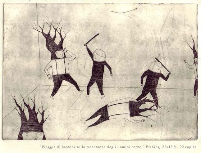 L’esposizione presenta alcune incisioni ad acquaforte nate dalla ricerca che gli stessi soggetti di questo immaginario sospeso hanno portato avanti per trovare la tecnica che più gli calzasse