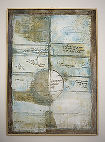 Nel “laboratorio alchemico” prevale un’aura di mistero, solo l’iniziato può muovere i propri passi, ma esiste un possibile spiraglio, una fenditura dove ad ognuno è dato entrare e questo sembra essere il tentativo di Bellucci, quando da artista interpreta il fascino arcano del mondo magico offrendolo nella complessità di forme e segni, organizzato esteticamente in forma della personale sensibilità espressiva. All’interno di questo “laboratorio” si può entrare, muovendosi tra simboli e materiali allusivi, espedienti, talvolta, per giungere alla definizione del rapporto tra umanità e cosmo. Le forme geometriche ricordano antichi disegni, testimonianze lontane di maestri del sapere giunte a noi per narrarci la rotta da seguire. I materiali sono quelli della trasmutazione simbolica: il carbone, l’oro, il verderame, lo zolfo, il sale, come richiamato dall’opera Elementi, per ognuno di loro c’è un particolare processo trasformativo che unito agli altri origina la scala per ascendere alla purezza (Fig. 2). Il mistero alchemico si fonde con quello spirituale, ogni materiale è strumento di crescita e proprio l’artista è depositario di tali conoscenze utilizzando gli stessi materiale per giungere alla magia della raffigurazione.